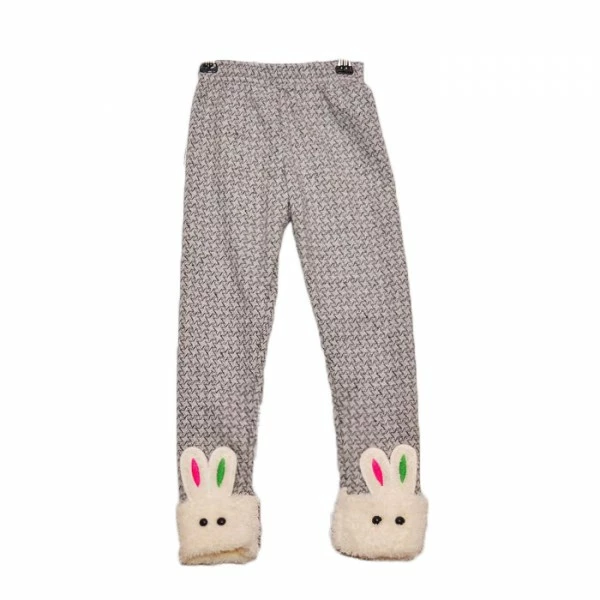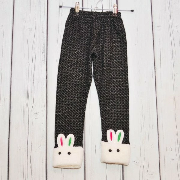 Основной массив брюк выполнен в черно-серой гамме с принтом звездочки, а низ изделия украшен белыми махровыми мордочками зайцев с глазками-бусинами и разноцветными вставками внутри ушек. даже такая игрушечная деталь как махровые заячьи головки не скатается и не утратит привлекательного внешнего вида даже при частом и долговременном ношении, поскольку в хлопковый массив волокна включено 5% полиэстера, который не скатывается, делает изделие устойчивым к вытиранию и позволяет сохранить привлекательный внешний вид даже при частых стирках или контакте с верхом сапог. Брюки – леггинсы имеют длину до косточки лодыжки и хорошо повторяют контуры тела ребенка, не стесняя движений, даже если под низ поддеть дополнительные колготки или лоссины.