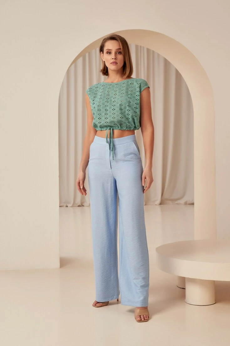 Ці прямі штани з еко-льону небесного відтінку немов створені для тих, хто прагне гармонії з природою. Матеріал, з якого вони зроблені, не тільки екологічно чистий, а й напрочуд м'який і приємний на дотик. Прямий крій підкреслює стрункість фігури, а комфортна посадка забезпечує свободу рухів, що робить ці штани ідеальним вибором для активних людей. Легко поєднуються з різними елементами гардероба, від блузок до топів, і дають змогу створювати яскраві та стильні образи. Чи то прогулянка містом, чи то зустріч із друзями, у цих штанах ви матимете неповторний і впевнений вигляд. Але найголовніше — носити ці штани означає піклуватися про своє здоров'я і навколишнє середовище, що робить їх ще більш привабливими і оригінальними.