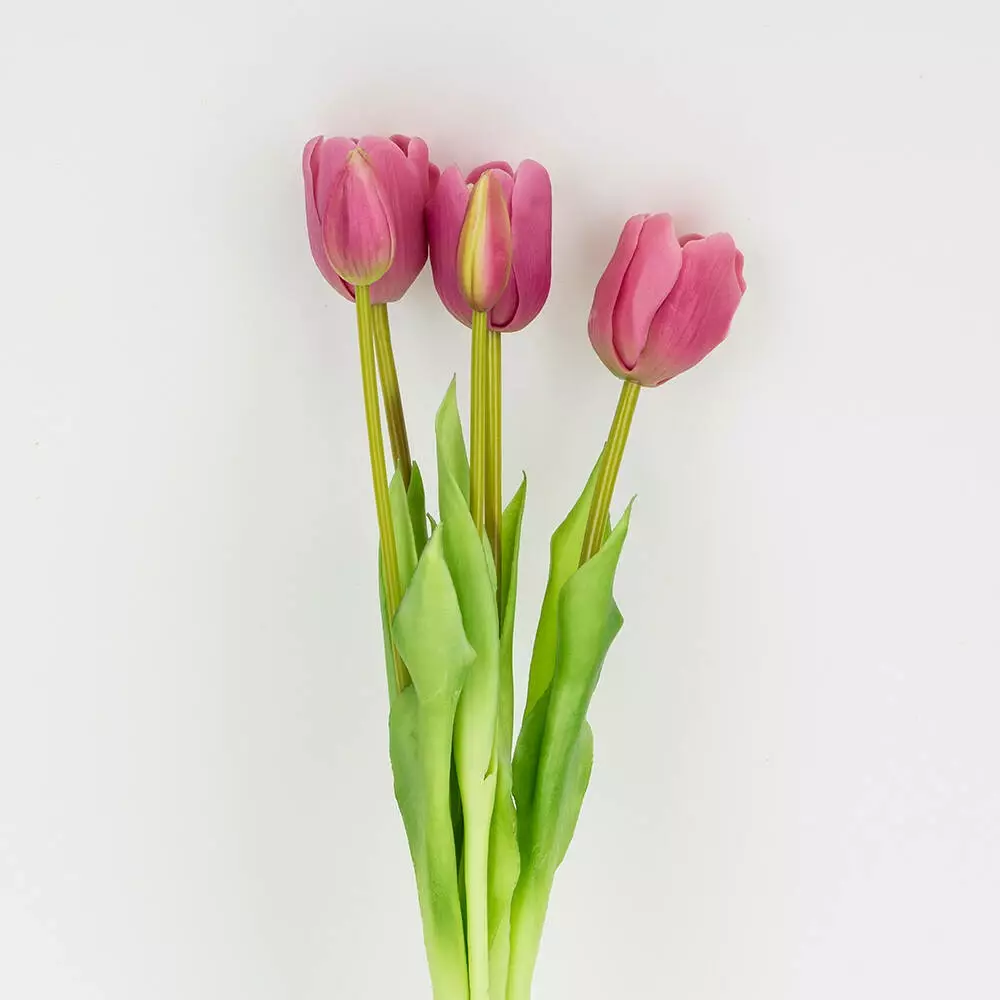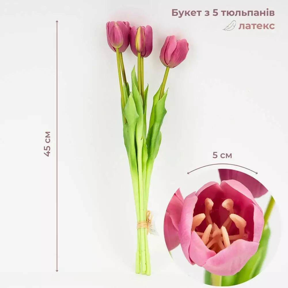 Букет латексних тюльпанів у лілово-рожевому відтінку виглядає ніжно, елегантно та максимально реалістично. Бутони діаметром близько 5 см мають природну форму і деталізовану серединку, а м’яка матова поверхня латексу точно передає текстуру живих квітів навіть при близькому розгляді.