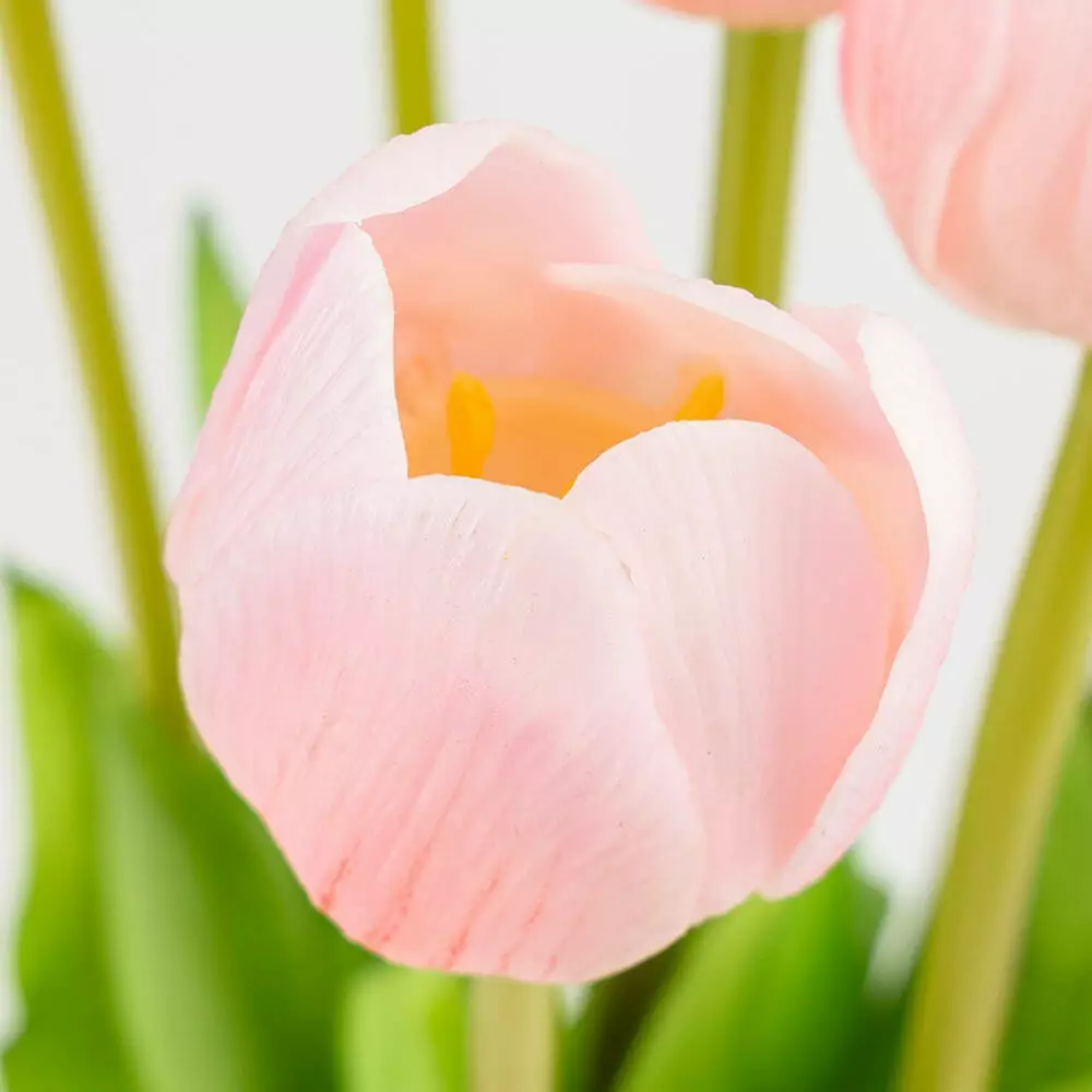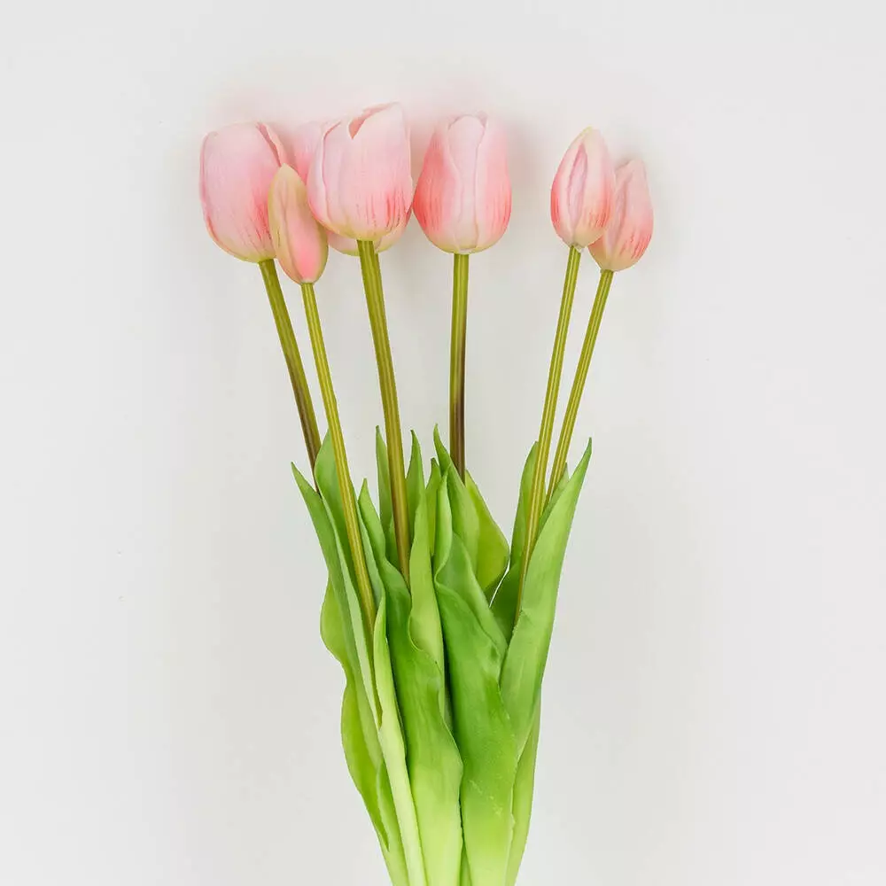 Букет латексних тюльпанів у ніжно-рожевому кольорі виглядає надзвичайно реалістично та елегантно, створюючи ефект живих квітів у вашому інтер’єрі. Композиція складається з семи акуратних бутонів діаметром близько 4 см, які мають природну форму і м’яку матову текстуру, властиву справжнім тюльпанам.