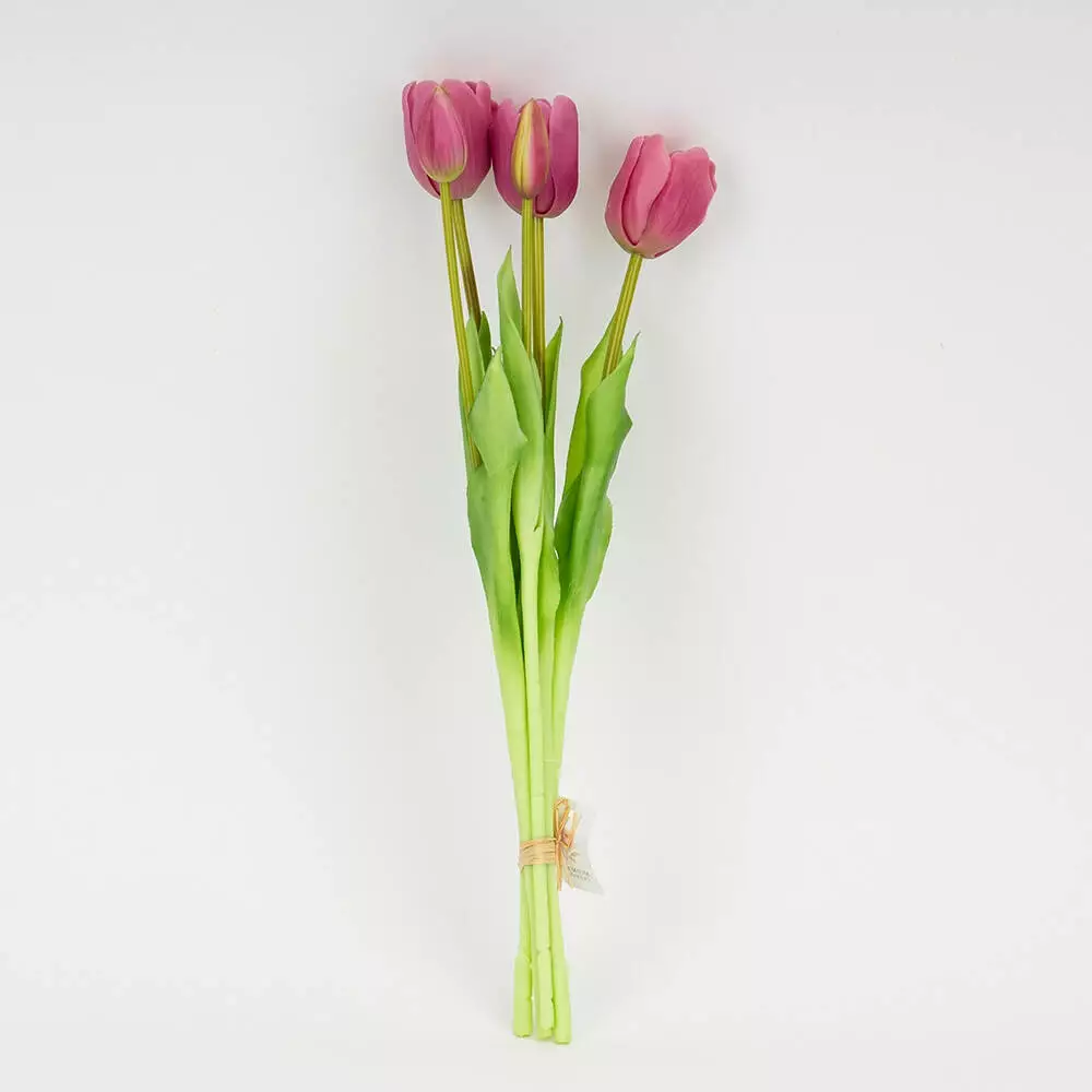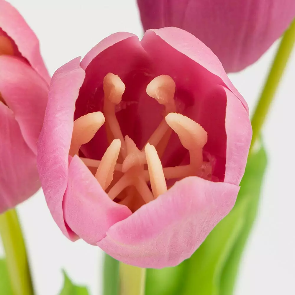Букет латексных тюльпанов в лилово-розовом оттенке смотрится нежно, элегантно и максимально реалистично. Бутоны диаметром около 5 см имеют естественную форму и детализированную серединку, а мягкая матовая поверхность латекса точно передает текстуру живых цветов даже при близком рассмотрении.