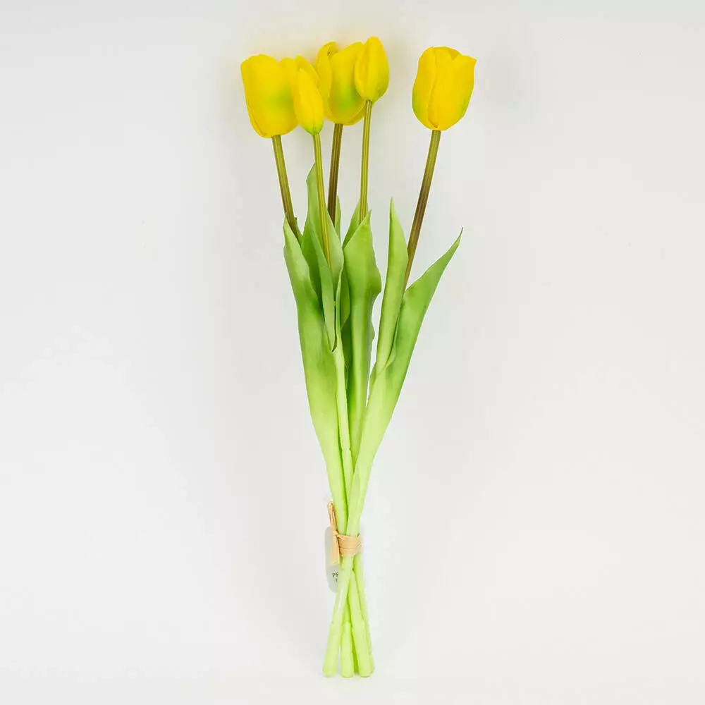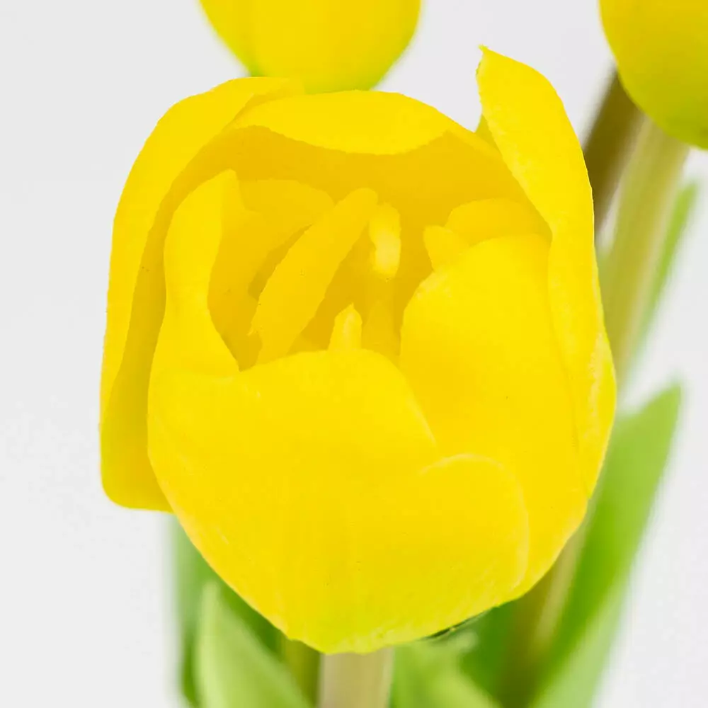 Эти тюльпаны не увядают и не нуждаются в уходе, позволяя надолго создать эффект живых цветов в пространстве. Желто-зеленый цвет добавляет интерьеру света, тепла и весеннего настроения, делая композицию стильным и универсальным элементом декора.