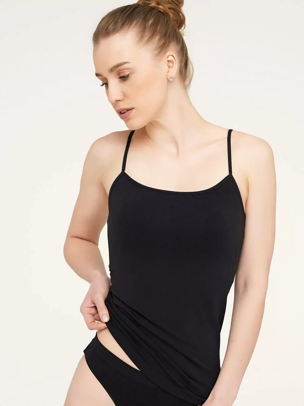 Жіноча безшовна майка з м’якої мікрофібри — комфортна база для щоденного гардероба. Модель без бічних швів із круглим вирізом забезпечує акуратну посадку та максимальну зручність. Еластичні бретелі не розтягуються, а тканина щільно облягає фігуру, створюючи легкий коригуючий ефект. Ідеально поєднується з будь-яким одягом.