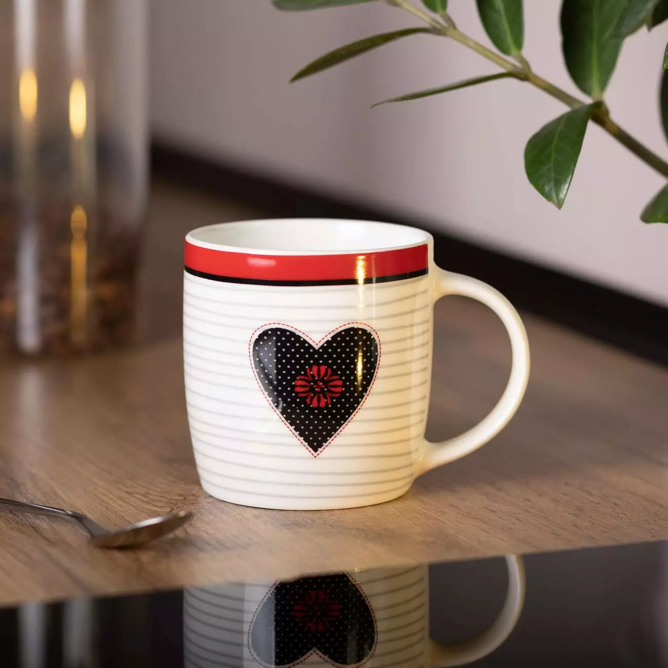 Декоративні елементи у вигляді сердечок додають чашці особливого шарму, роблячи її гарним вибором для будь-якої кухні. Виготовлена з якісного порцеляни, вона має міцну конструкцію та довговічне покриття. Важливою перевагою є можливість використання чашки в мікрохвильовій печі.
