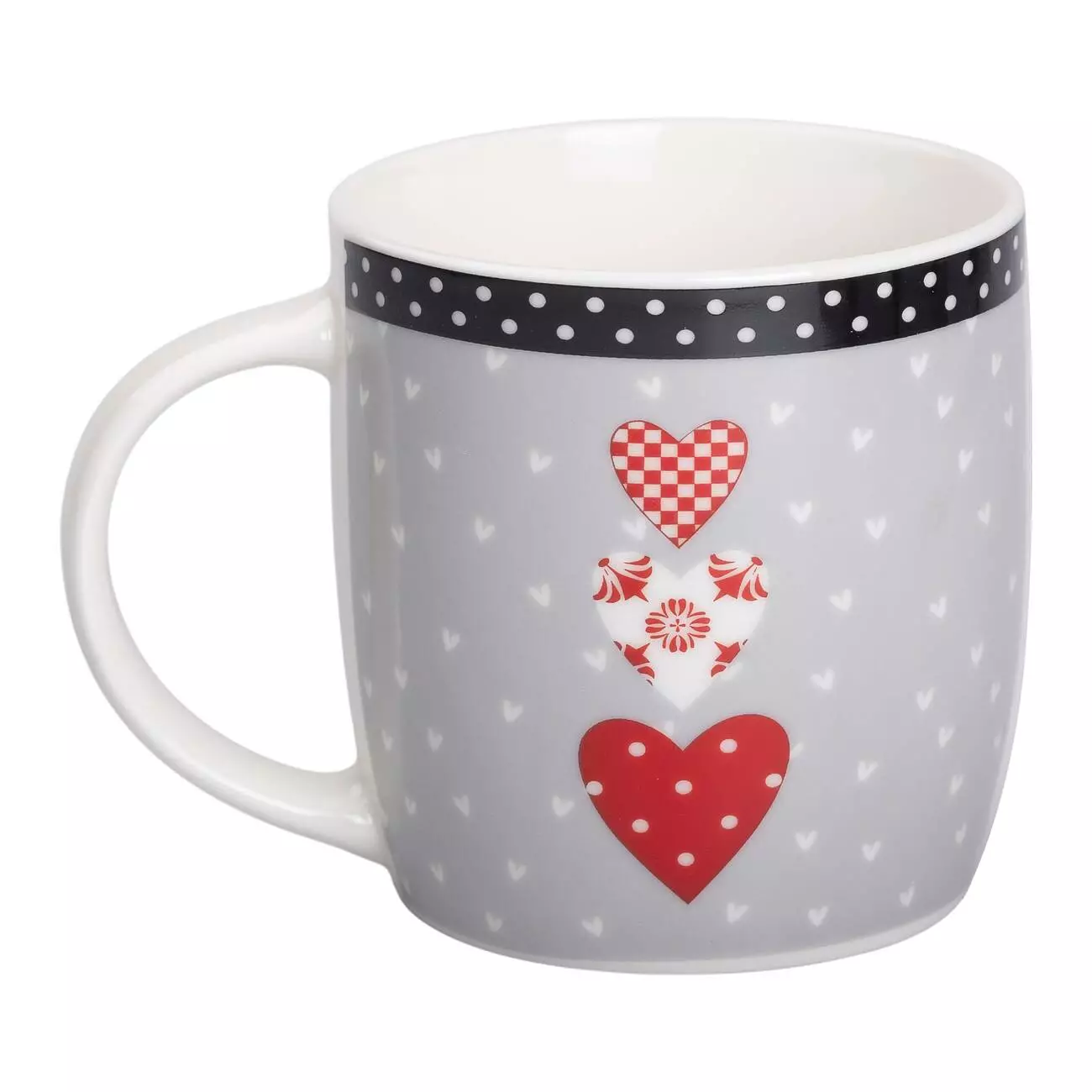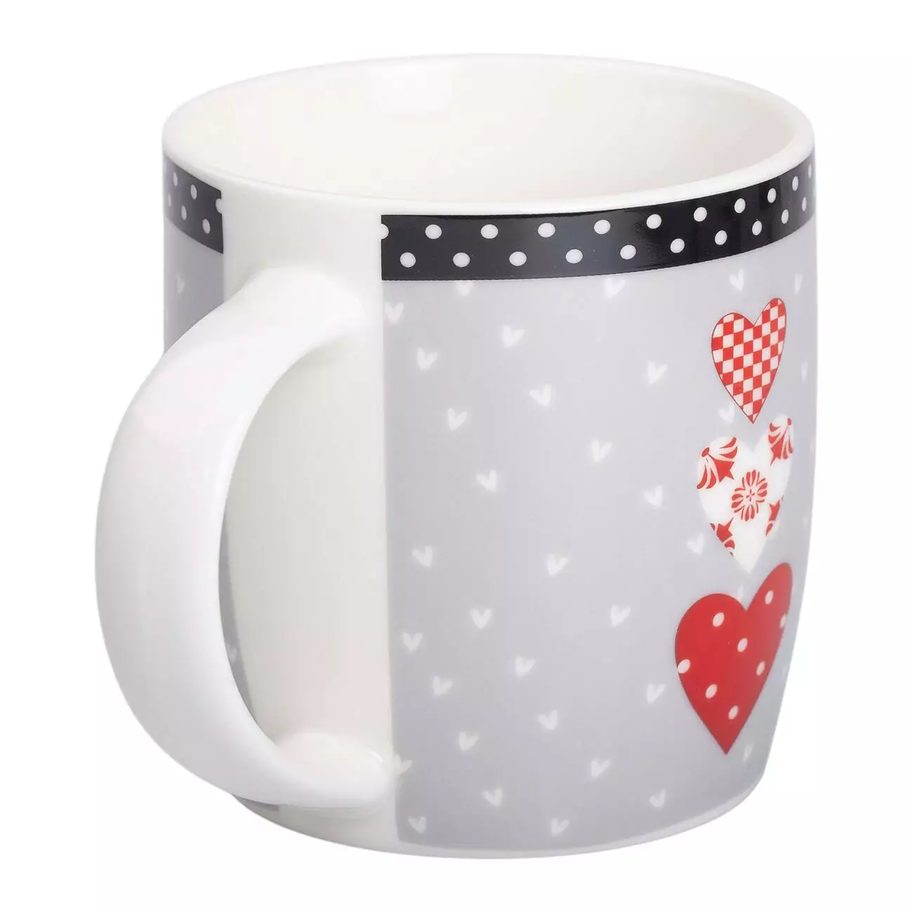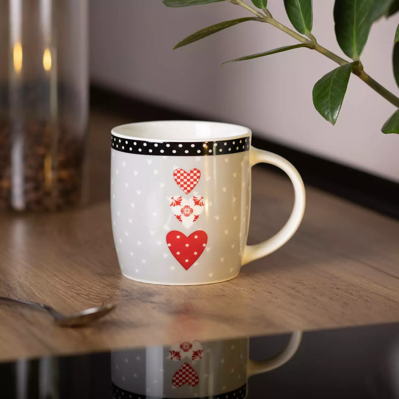 Декоративні елементи у вигляді сердечок додають чашці особливого шарму, роблячи її гарним вибором для будь-якої кухні. Виготовлена з якісного порцеляни, вона має міцну конструкцію та довговічне покриття. Важливою перевагою є можливість використання чашки в мікрохвильовій печі.
