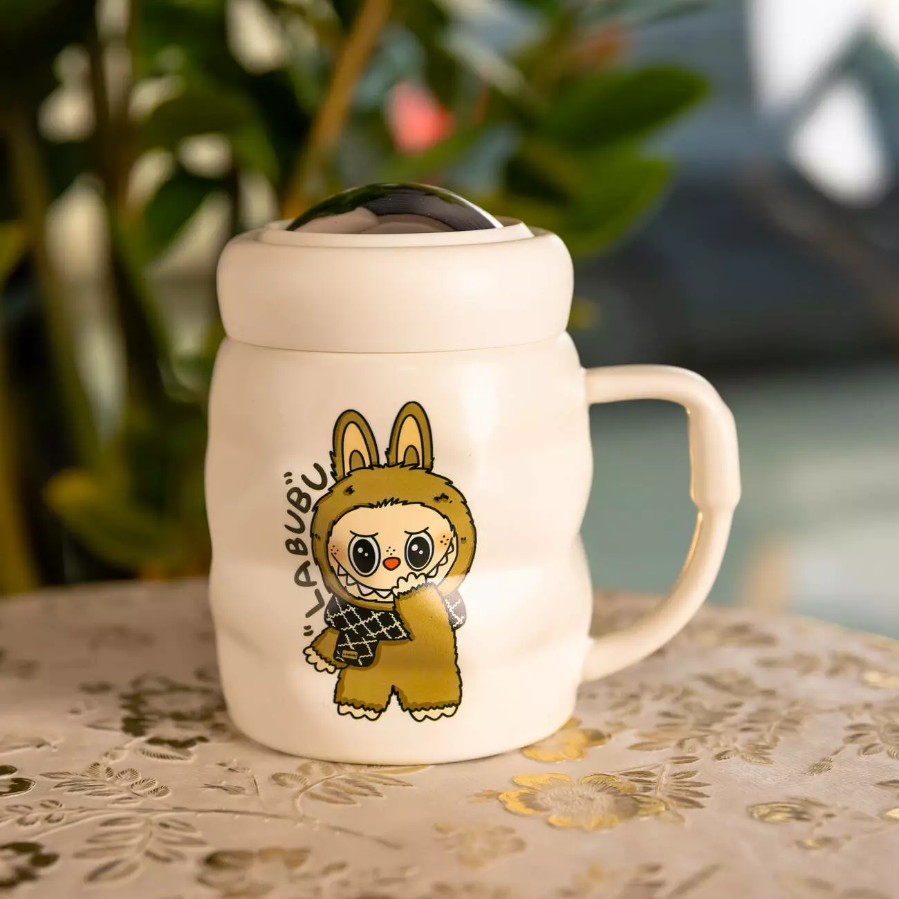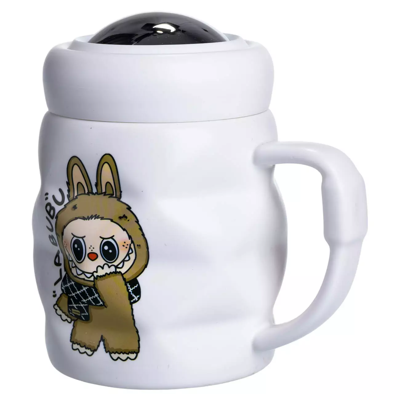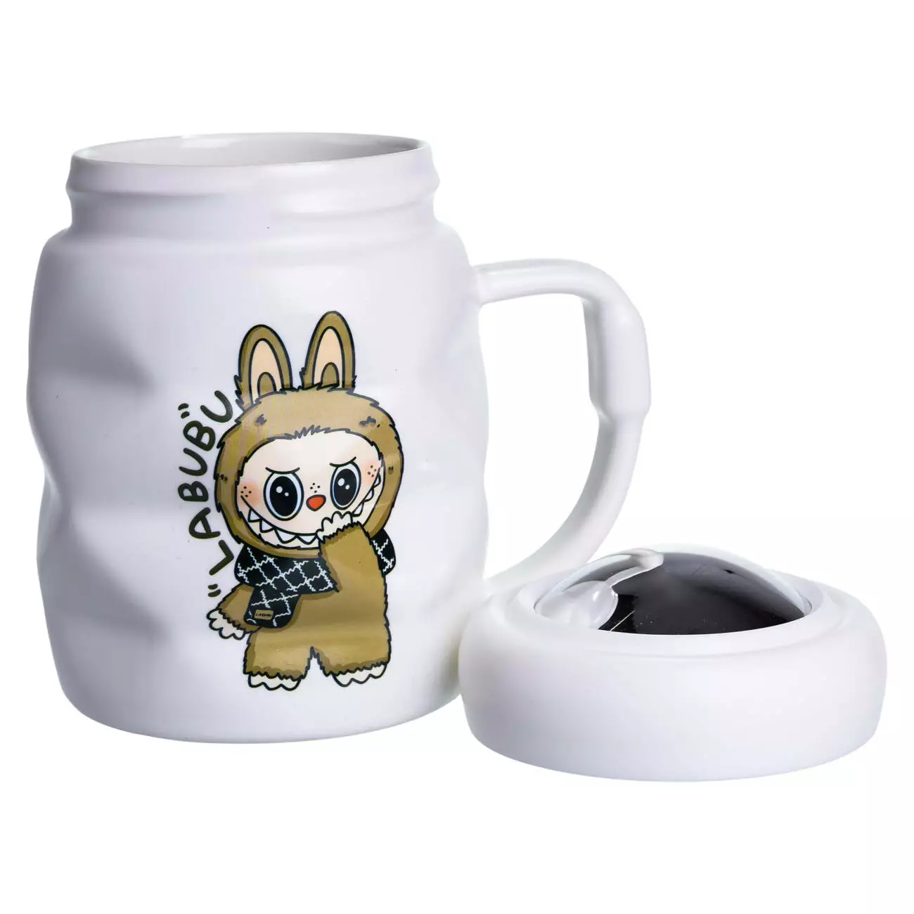 На передній частині розміщено зображення та напис LABUBU, виконаний у друкованому стилі. Цей акцент робить чашку впізнаваною і додає їй колекційного вигляду. Виріб доповнено куполоподібною кришкою з порцеляни, яка щільно прилягає до країв і допомагає зберегти температуру напою. Кришка легко знімається і проста в догляді.