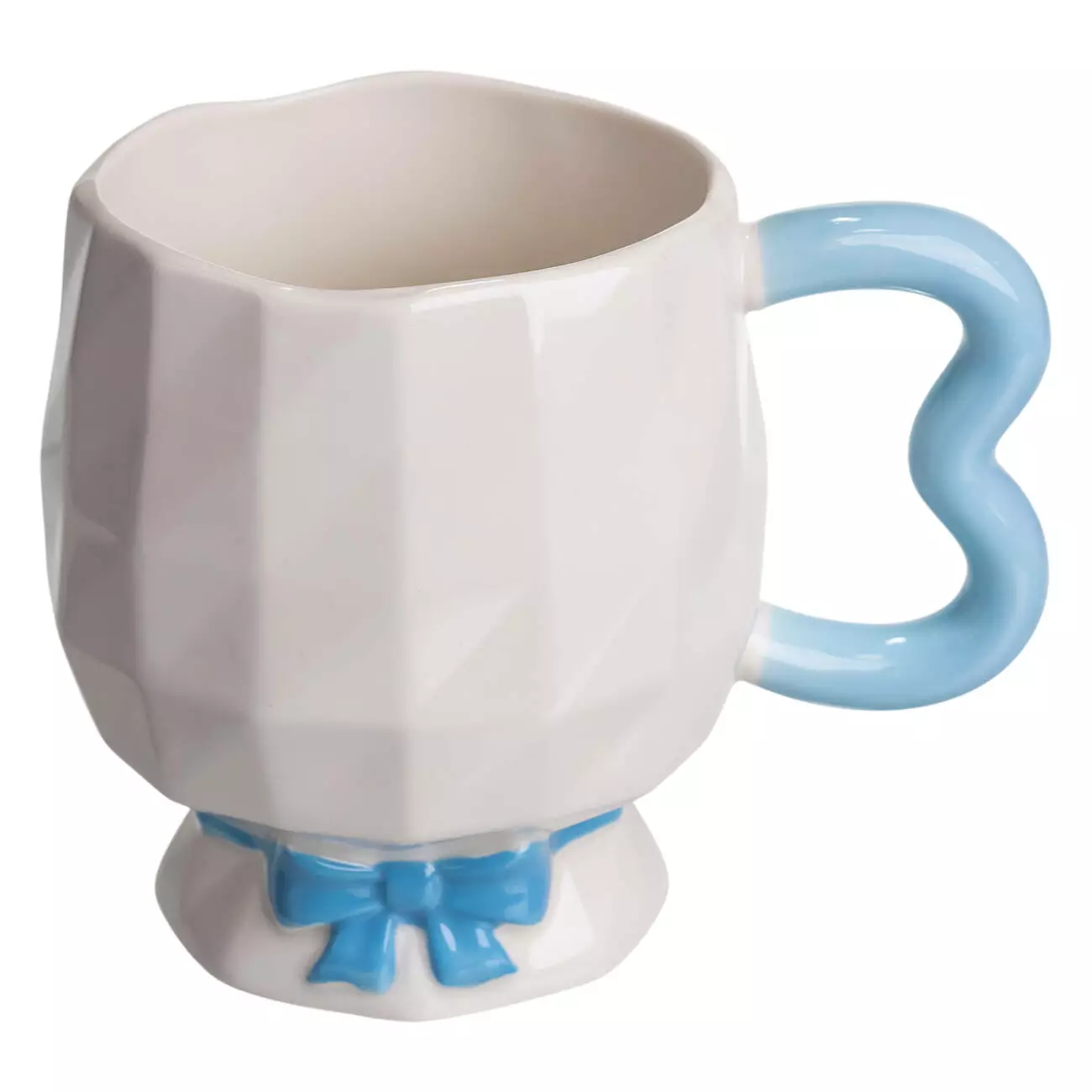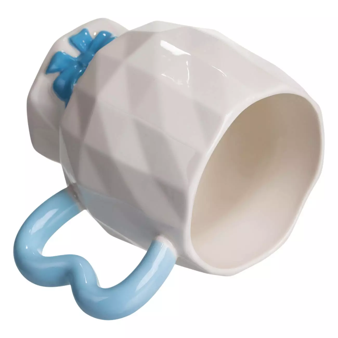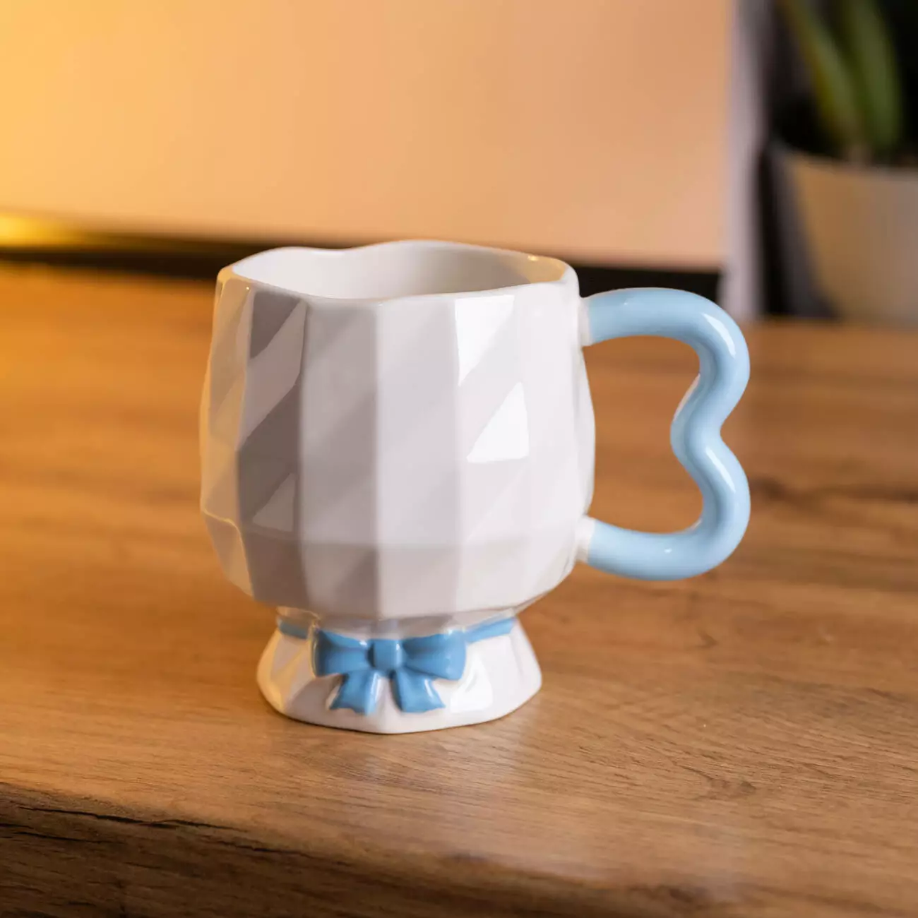 Особливістю конструкції є декоративна основа у вигляді рельєфного банта, розміщеного біля ніжки. Цей елемент інтегрований у корпус чашки та не виступає окремою частиною. Ручка має фігурну форму з плавними вигинами, що додає виробу індивідуальності та зручності у триманні. Висота чашки становить 10 см, що робить її придатною для щоденного використання або як частину тематичного сервірування.