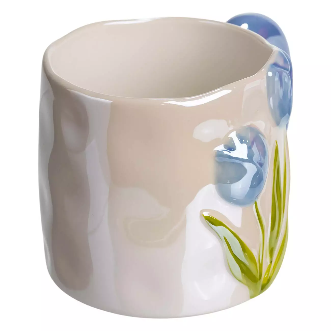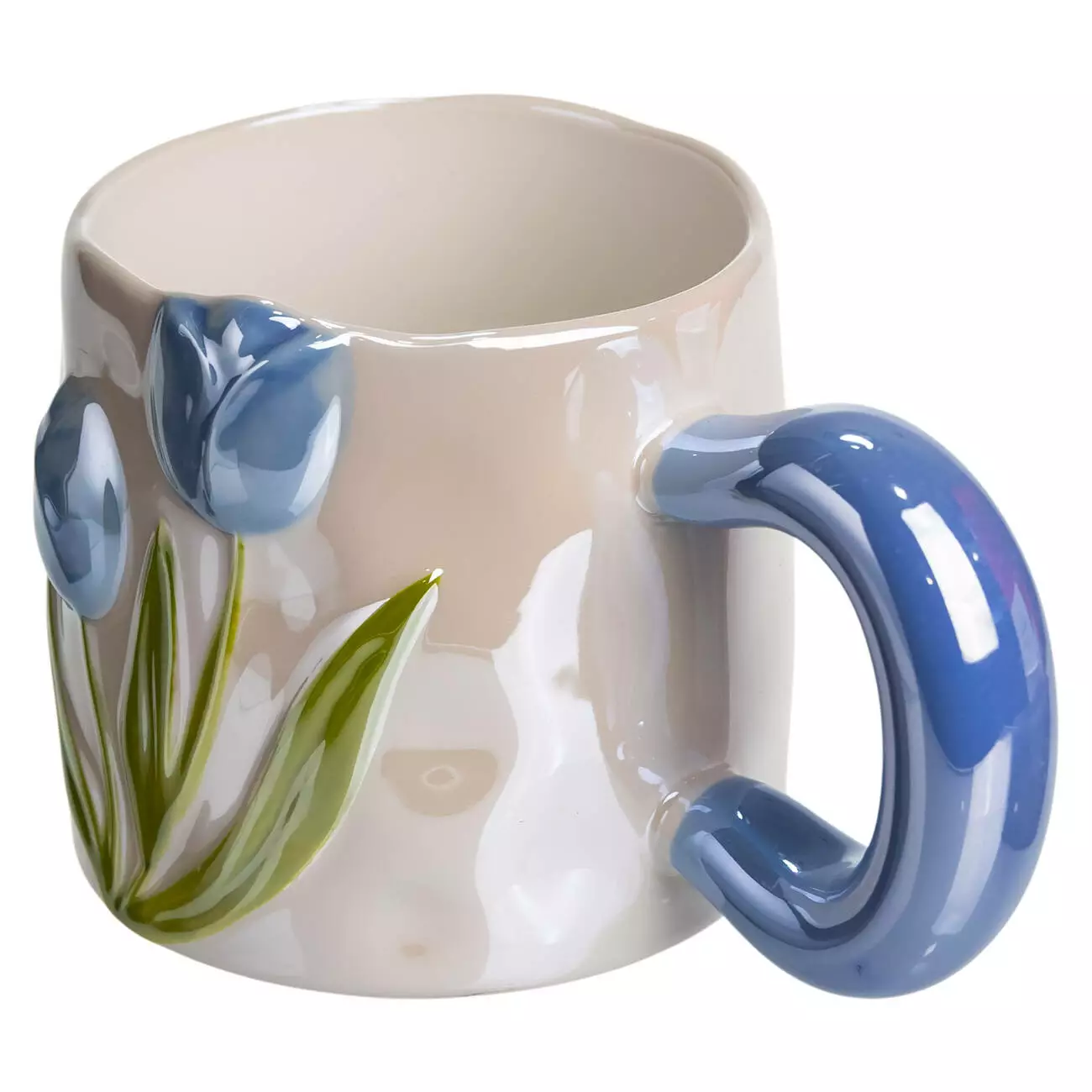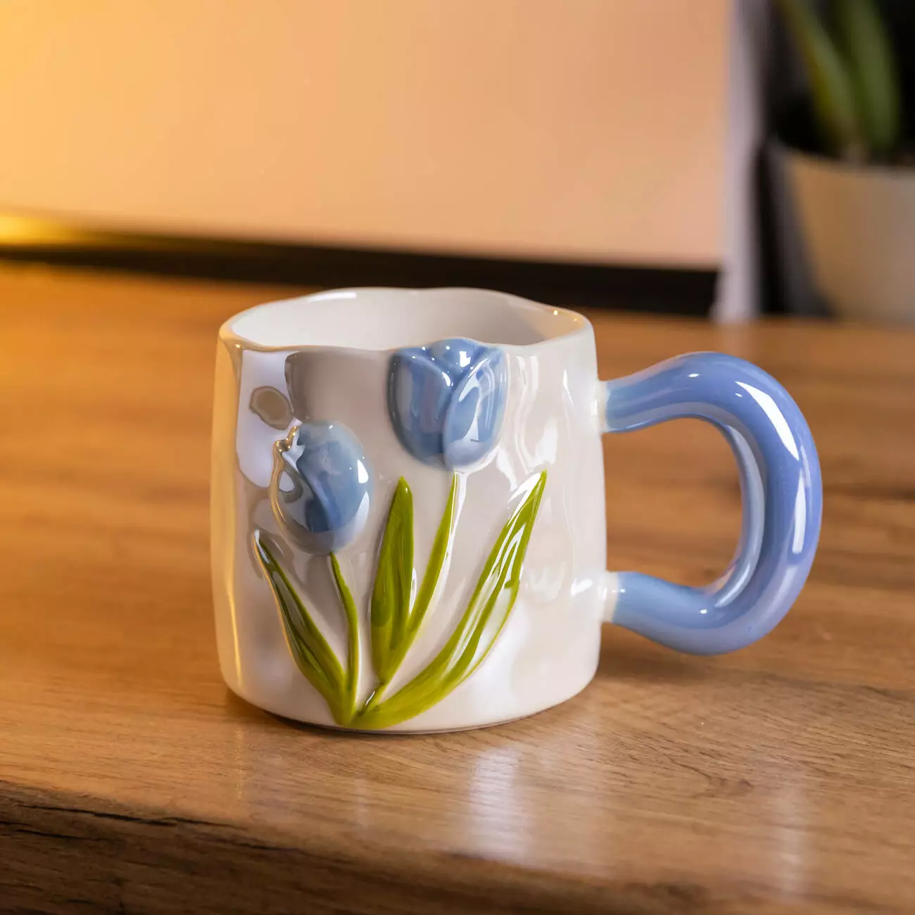 Зовнішня частина прикрашена об’ємним декоративним зображенням тюльпана, виконаним із тієї ж порцеляни, що й корпус чашки. Такий декор створює приємний візуальний акцент і додає виробу ніжності та елегантності, зберігаючи при цьому його стриманий стиль. Ручка плавної, зручної форми забезпечує комфортне тримання навіть під час щоденного використання.