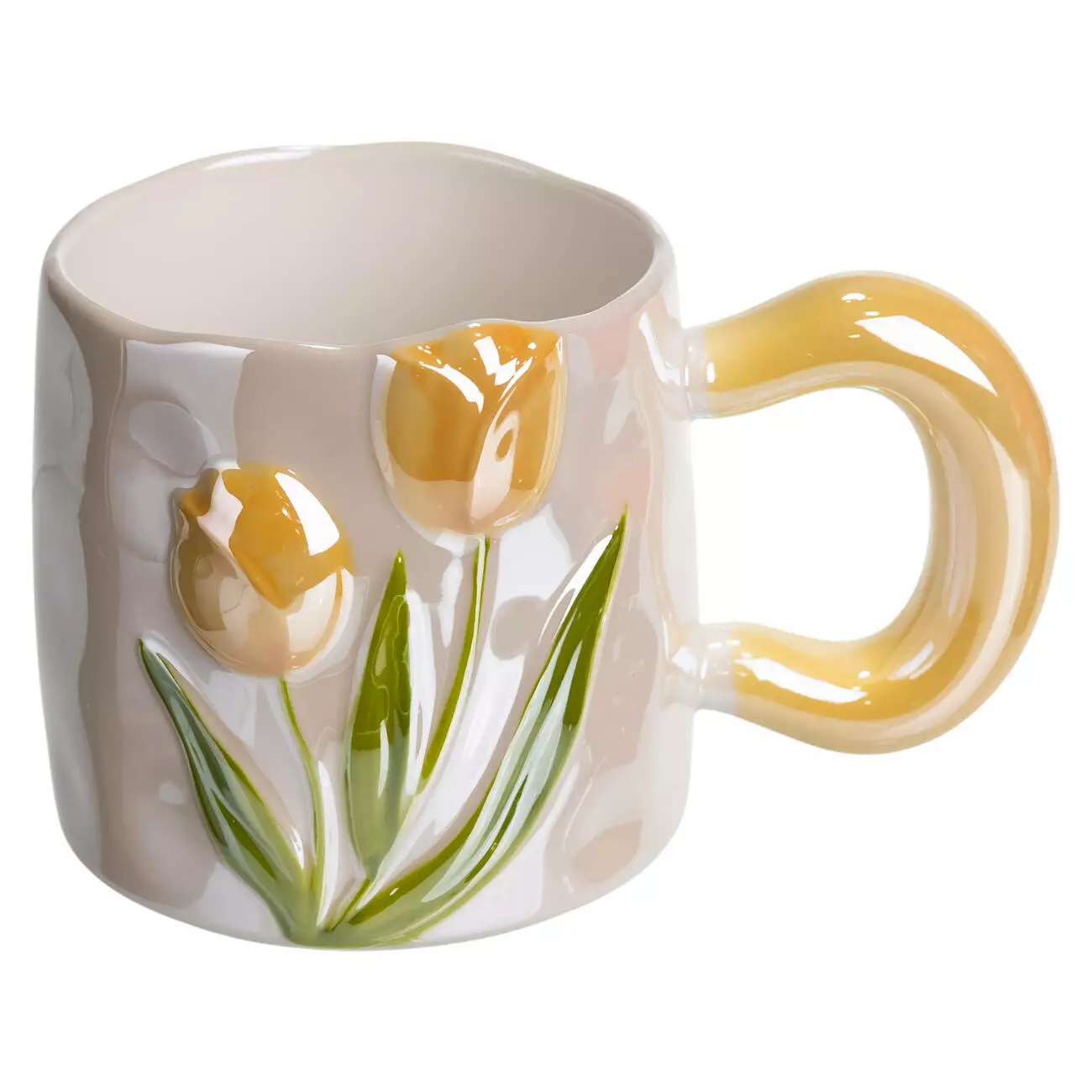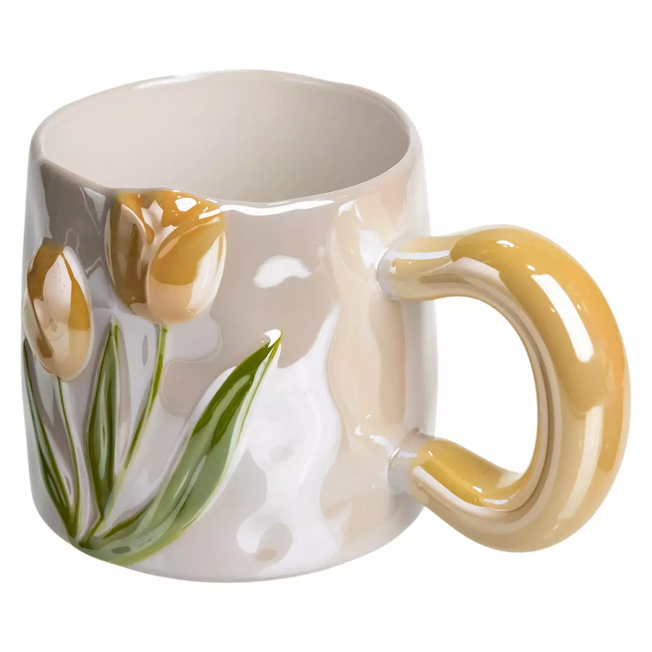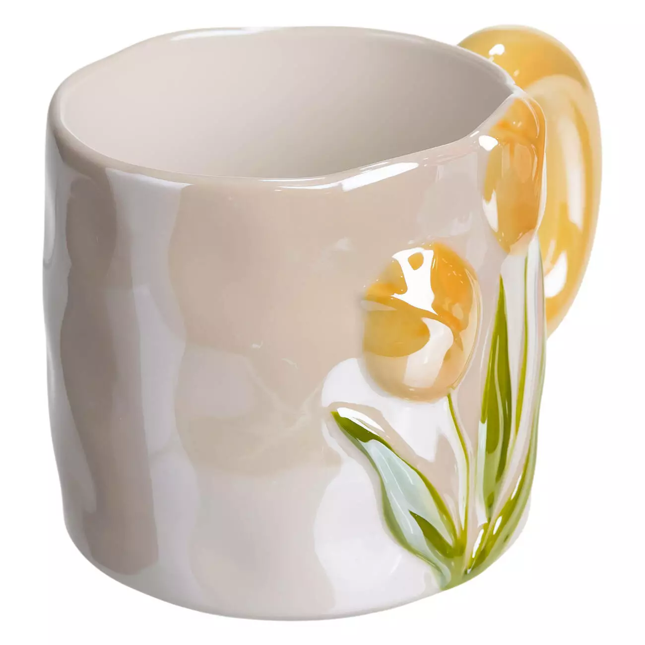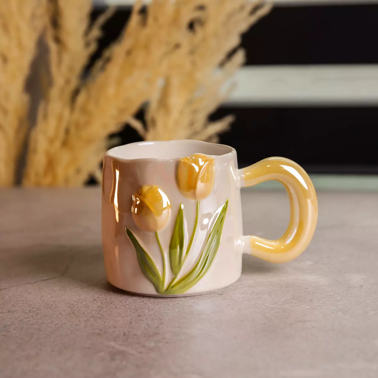 Зовнішня частина прикрашена об’ємним декоративним зображенням тюльпана, виконаним із тієї ж порцеляни, що й корпус чашки. Такий декор створює приємний візуальний акцент і додає виробу ніжності та елегантності, зберігаючи при цьому його стриманий стиль. Ручка плавної, зручної форми забезпечує комфортне тримання навіть під час щоденного використання.
