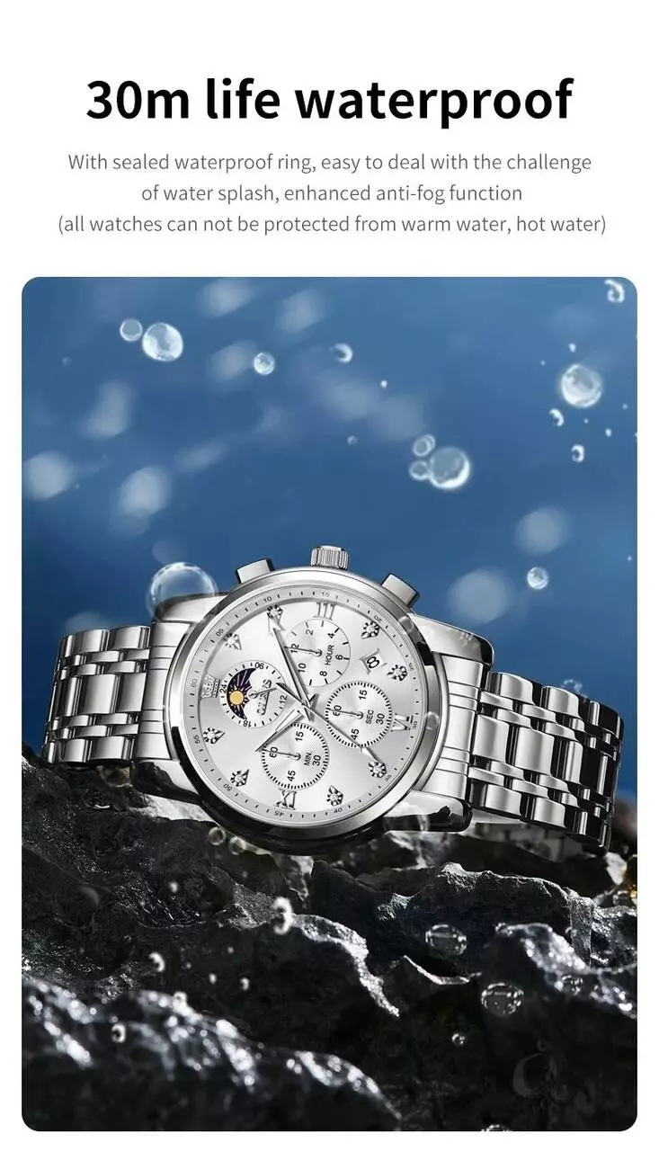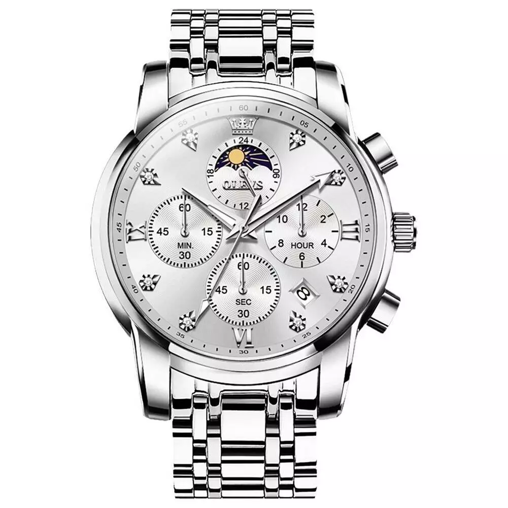 Часы наручные OLEVS 3655 – это сочетание сдержанной классики и многофункциональности. Они подойдут как для делового образа, так и для активной повседневной носки. Благодаря высокоточному японскому кварцевому механизму Citizen часы демонстрируют стабильный ход. Хронограф с тремя субциферблатами, индикатор фазы луны и двойной календарь (день/дата) делают этот аксессуар чрезвычайно практичным. Световое покрытие на стрелках обеспечивает удобство чтения в темноте, а водозащита 3 ATM позволяет не снимать часы во время дождя или мытья рук. Корпус из прочного сплава и ремешок из нержавеющей стали гарантируют долговечность, а стекло Hardlex защищает от царапин.