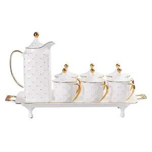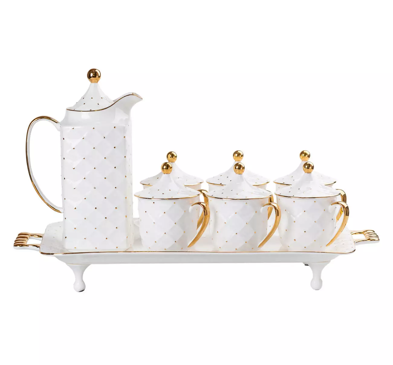 Чайний сервіз порцеляновий на 6 персон — це елегантний набір із 8 предметів, створений для витончених чаювань. До сервізу входить чайник об'ємом 2 л, шість чашок об'ємом 400 мл, і порцелянова таця на ніжках. Кожен елемент набору виконаний у білому кольорі з оздобленням золотим обідком, що додає сервізу вишуканого вигляду. Особливістю цього набору є кришки до чашок, які допомагають зберігати тепло та забезпечують додатковий комфорт під час чаювання.