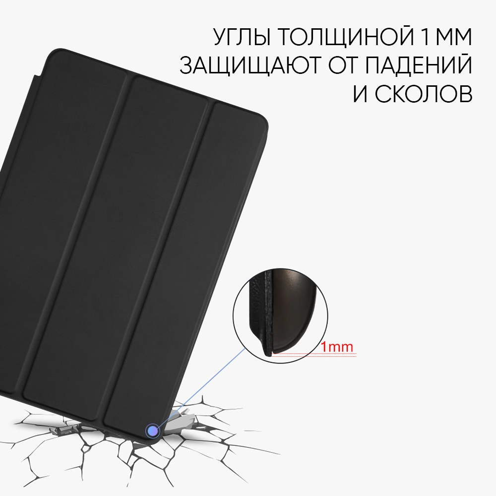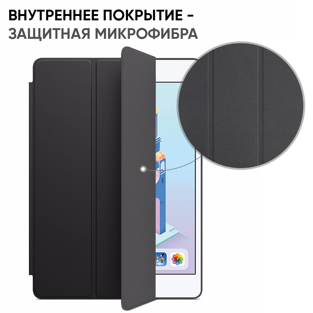Черный цвет обложки отлично гармонирует с планшетом и будет смотреться стильно в любой ситуации. Внутренняя часть из микрофибры надежно прилегает к экрану, не пропуская пыль и мелкие частицы.