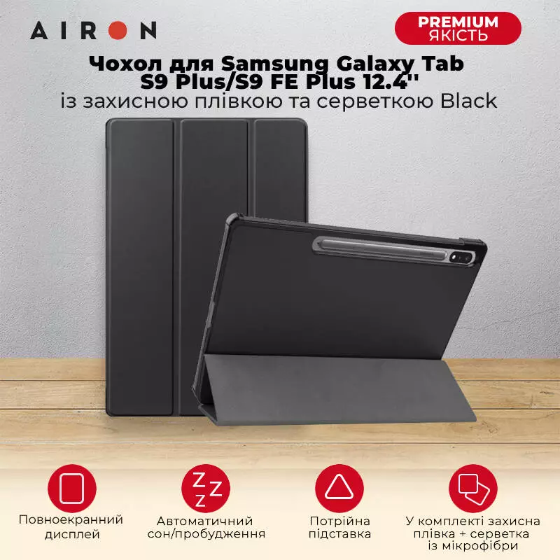 Чехол AIRON Premium для Samsung Galaxy Tab S9 Plus/S9 FE Plus 12.4'' 2023 с защитной пленкой и салфеткой черного цвета.