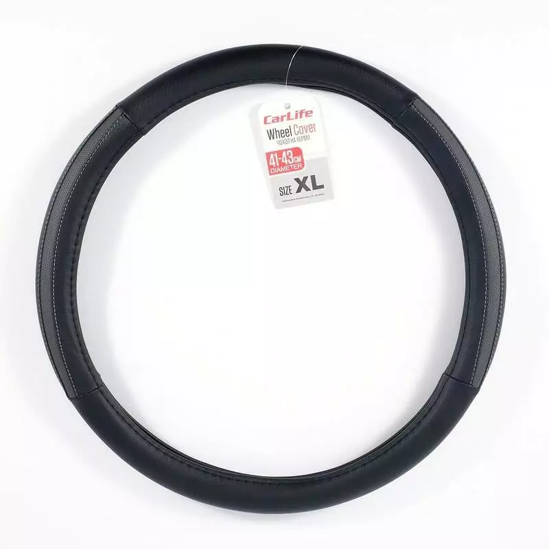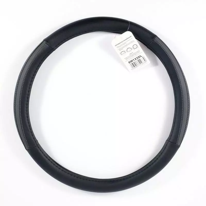 Чехол на руль XL (41-43 см) из экокожи и белой резины CARLIFE черный с серыми вставками и перфорацией (SW123XL)