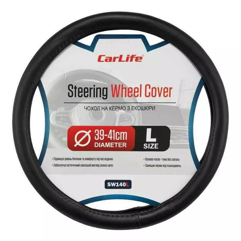 Чохол на кермо Carlife 39 - 41см, екошкіра, чорний, один шов (SW140L)