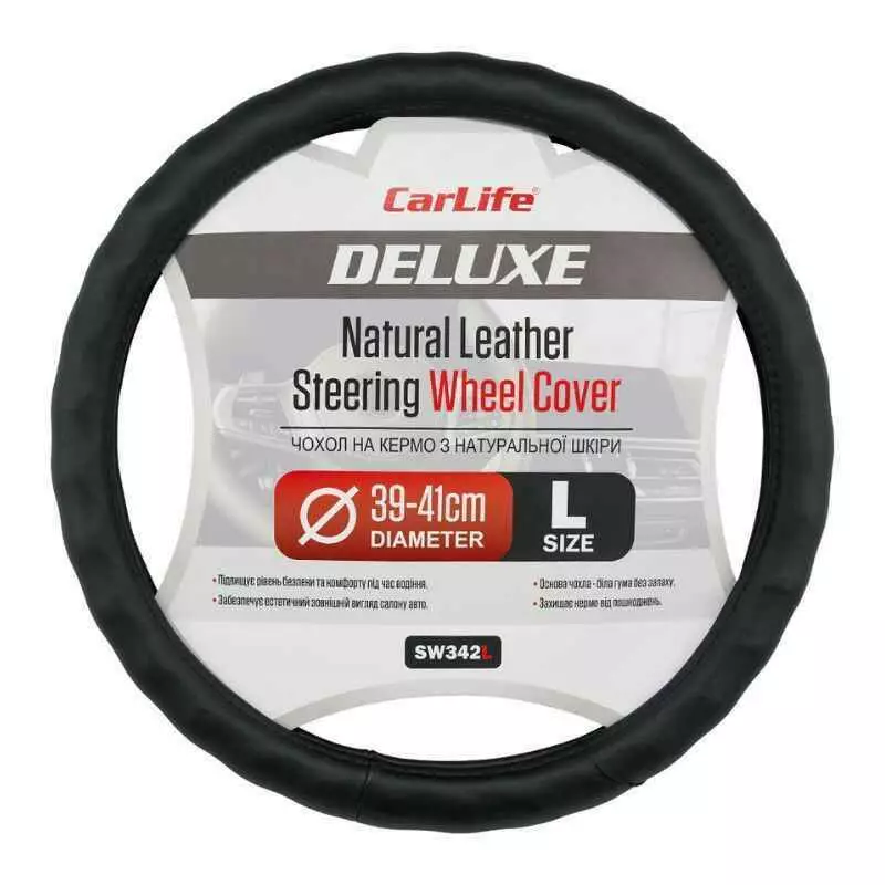 Чохол на кермо Carlife 39-41см, шкіра, чорний, біла гума, один шов