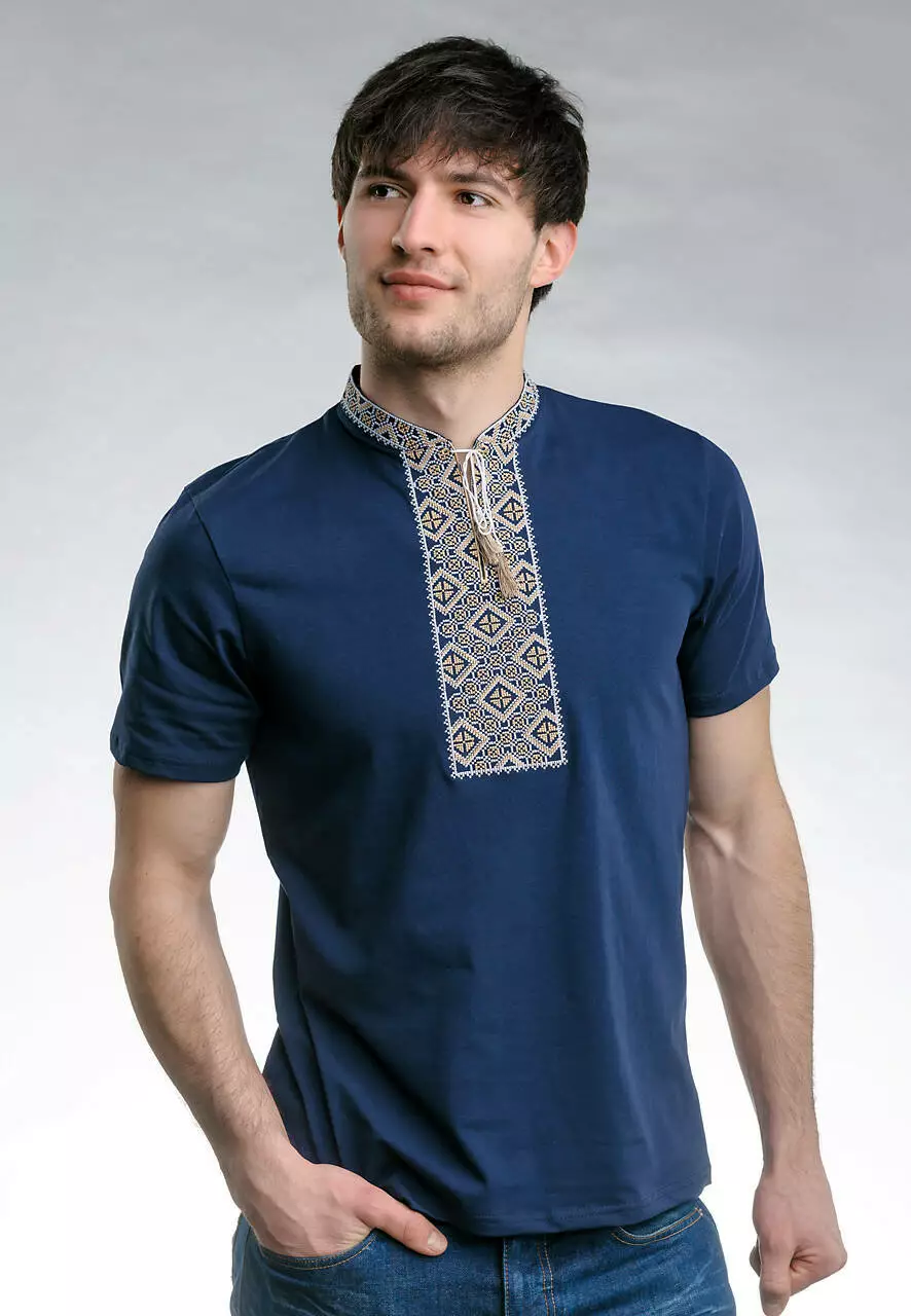 Вишивка виконана на тканині темно-синього кольору бежевими нитками. Матеріал – бавовна. Футболка вдало поєднується із улюбленими джинсами чи класичним костюмом. Вона пасуватиме і на щодень, і на свята.