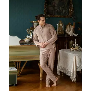 Чоловічий домашній натуральний костюм з льону. Комплект: сорочка на ґудзиках із кишенею на грудях та комірцем-стійкою і вільні штани з кишенями із зав'язкою на резинці. Матеріал досить приємний, добре пропускає повітря, не прилипає до тіла, не линяє після прання, зносостійкий. Це чудовий варіант домашнього одягу для чоловіків, що поєднує в собі стиль, комфорт та практичність.
