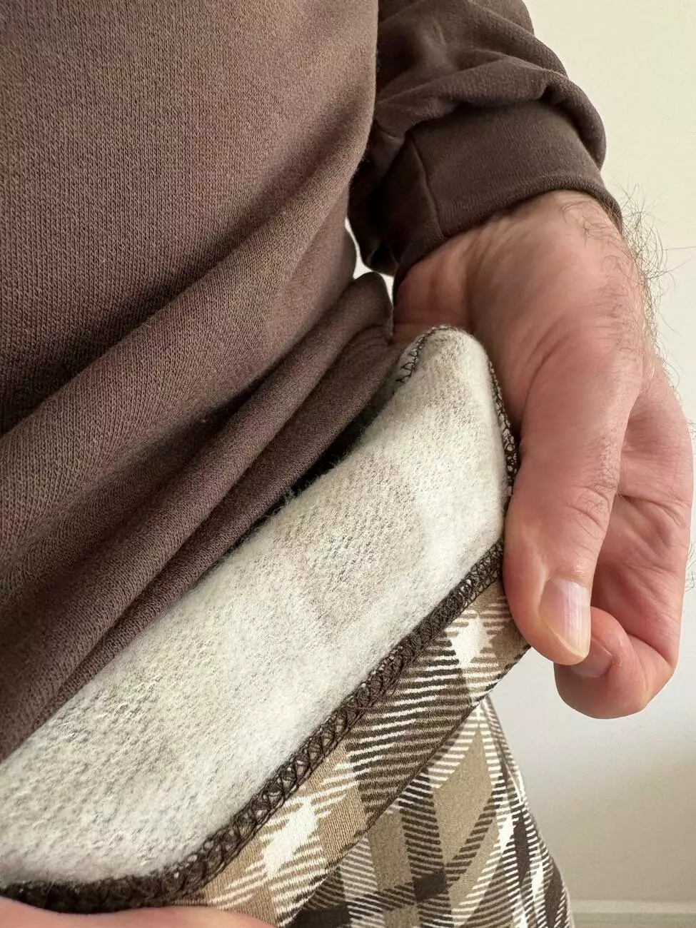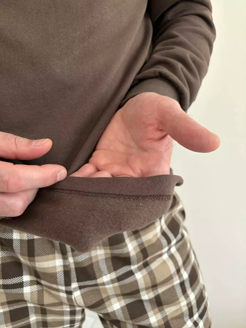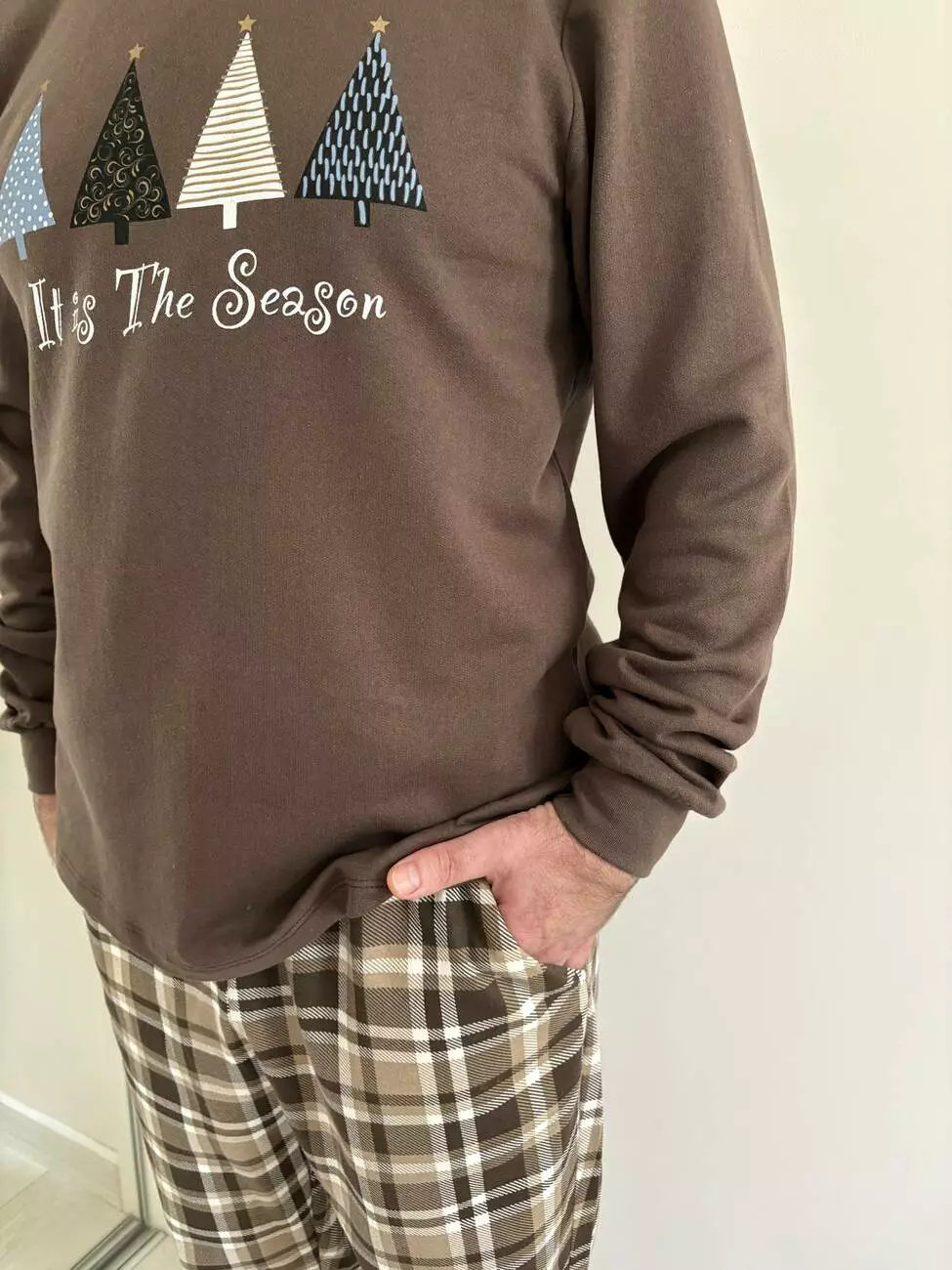 Створи атмосферу зимових свят разом із чоловічою піжамою, що поєднує комфорт, тепло та стиль. Комплект складається з м’якого свитшота шоколадного кольору з начісом та затишних штанів у коричнево-бежеву клітинку. Манжети внизу штанів додають комфорту та допомагають зберігати тепло у найхолодніші вечори. Фірмовий акцент — новорічні ялинки та напис “It is The Season” на свитшоті. Це той самий святковий настрій, що піднімає дух навіть у сірий зимовий день. Піжама виготовлена з утепленого трикотажу з начосом (100% бавовна), який: - дуже м’який на дотик, - чудово утримує тепло, - не перегріває тіло, - вбирає природну вологу і залишає шкіру сухою та комфортною. Штани мають зручну посадку та місткі кишені, роблячи цю модель не лише святковою, а й максимально практичною для щоденного домашнього відпочинку. До цієї піжами є жіноча пара — створіть гармонійний сімейний комплект для зимових вечорів, святкових фото або просто для затишних обіймів удвох під теплим пледом. Ефект тканини: теплий м’який начіс з внутрішньої сторони Як доглядати за виробом: Ручне чи машинне прання при температурі не більше 30 градусів. Перед машинним пранням річ має бути вивернута навиворіт (лицьовою стороною всередину). Можна використовувати будь-які миючі засоби, але краще надати перевагу гелям для прання. Віджимати на мінімальних обертах 400. Сушити виріб необхідно в розправленому вигляді в горизонтальному положенні, далеко від нагрівальних приладів та прямих сонячних променів.