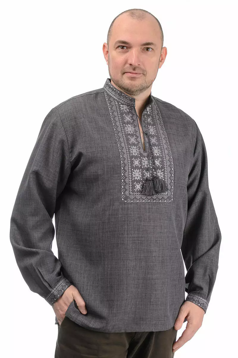 Головною окрасою й одночасно чарівною відмінністю сорочки є вишиті геометричні орнаменти. Білий візерунок довершує елегантний образ і робить виріб ще більш оригінальним. Крій сорочки вільний, рукава на манжетах і застібаються на ґудзик.