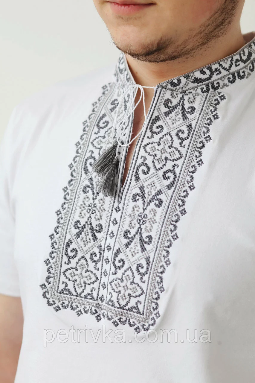 Біла футболка з коротким рукавом, машинна вишивка хрестиком