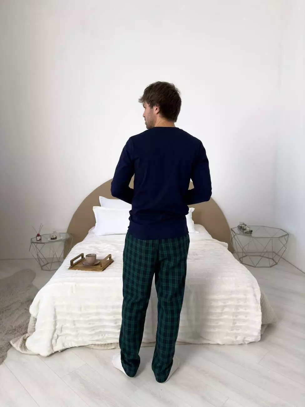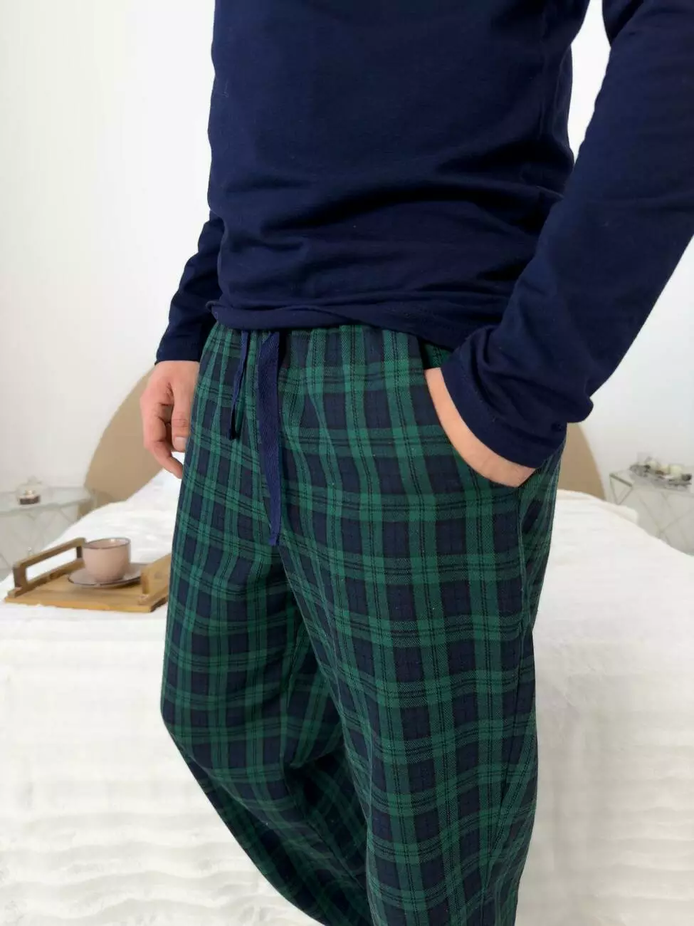 Наші нові чоловічі піжамні штани — це ідеальний баланс елегантності та зручності. Зелено-темно-синя клітинка надає образу витонченості, створюючи стильний акцент у домашньому гардеробі. Регульований пояс на кулісці дозволяє підігнати посадку під себе, забезпечуючи комфорт протягом усього дня.