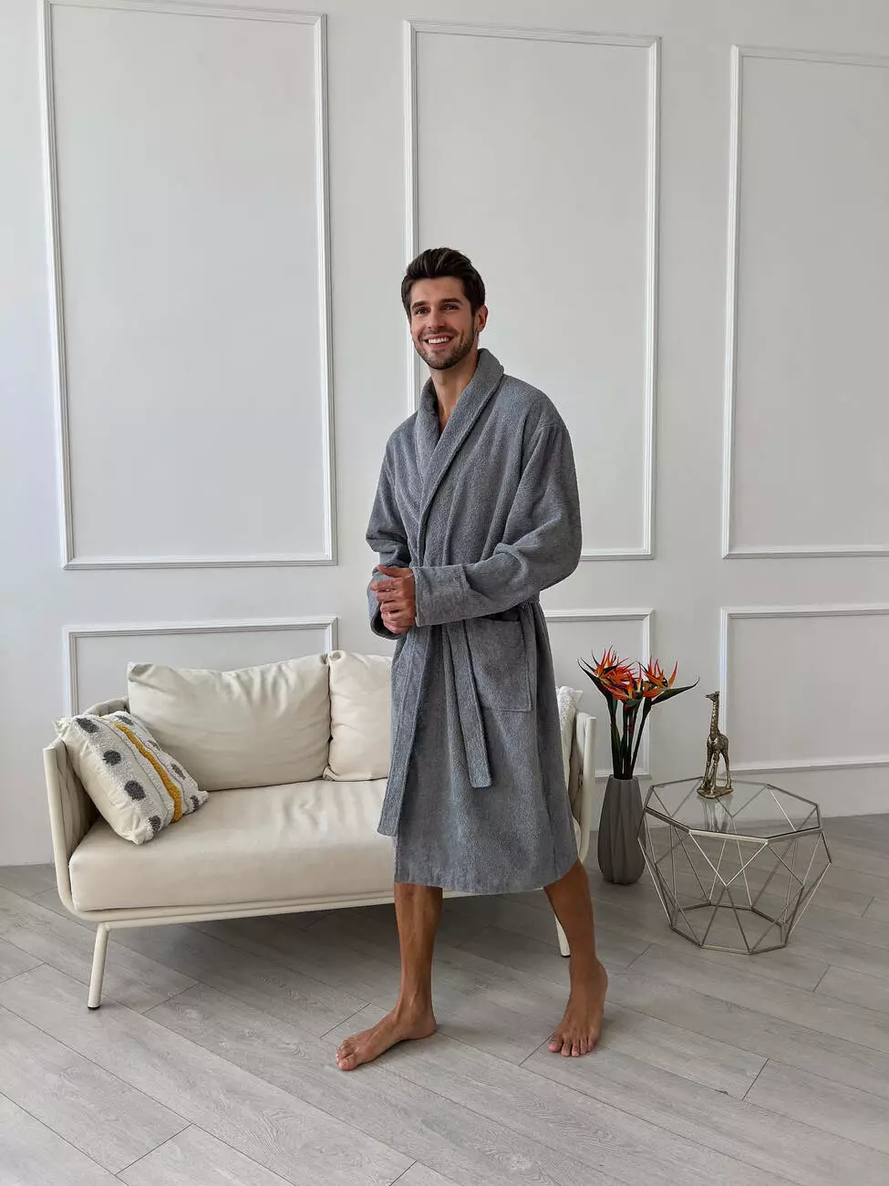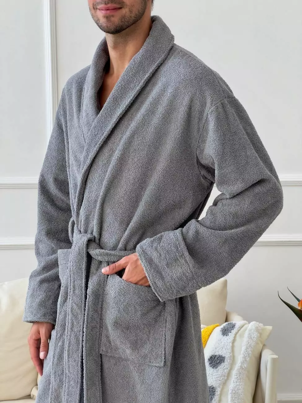 Елегантний чоловічий халат із шалевим коміром із махрової тканини.