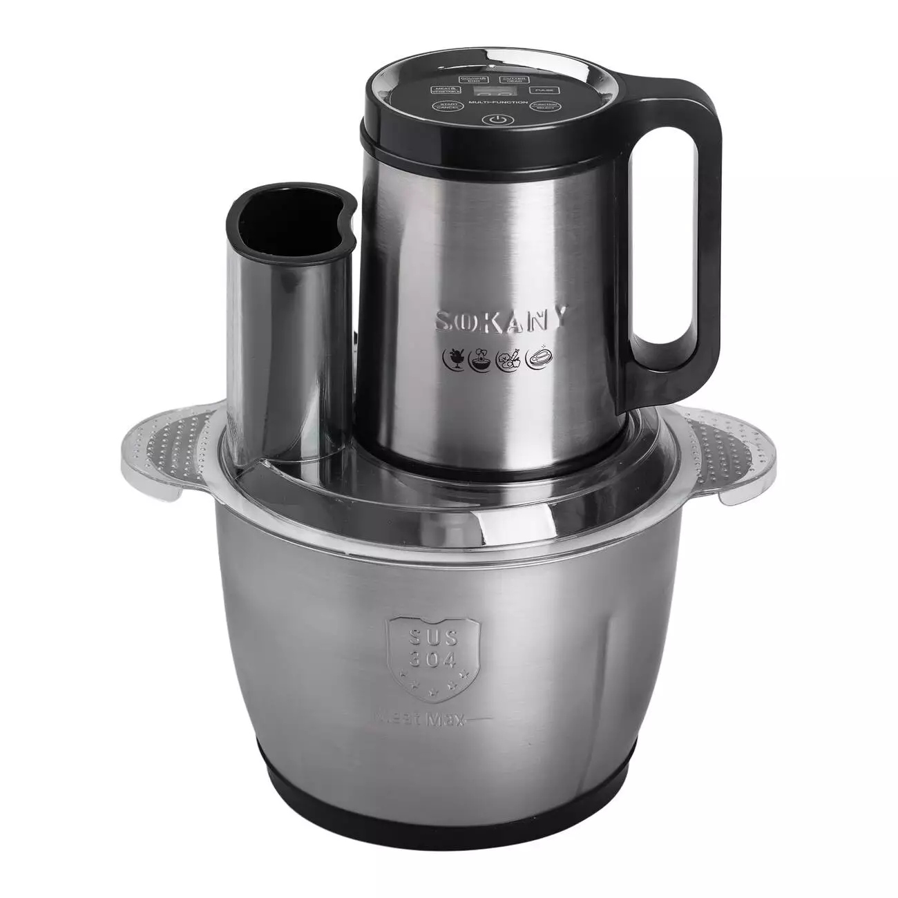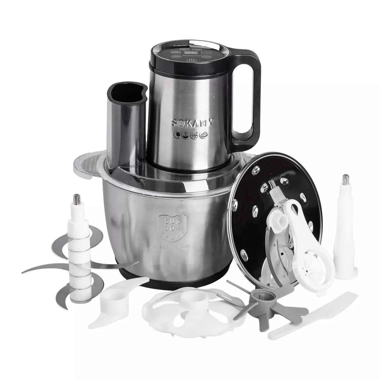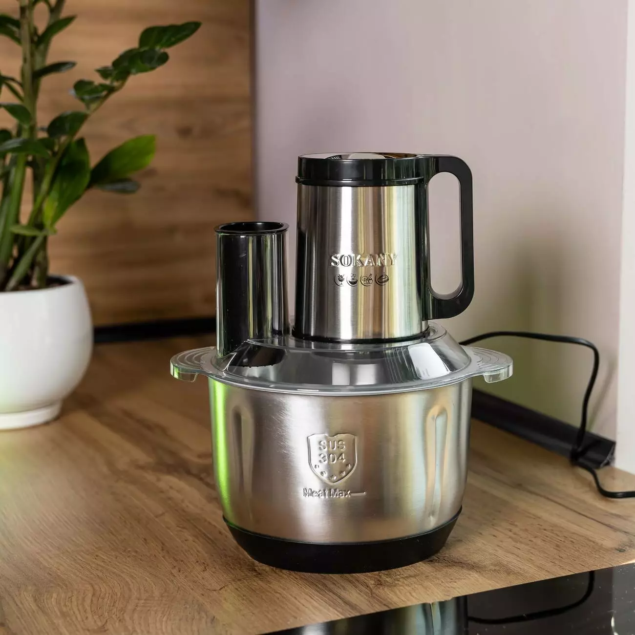 Корпус пристрою виготовлений із комбінації нержавіючої сталі та пластику, що забезпечує його довговічність і стійкість до механічних пошкоджень. Чаша з нержавіючої сталі не вбирає запахи та легко очищується після використання. Sokany SK-06035 оснащений чотирма режимами швидкості, що дозволяє регулювати інтенсивність подрібнення залежно від типу продуктів.