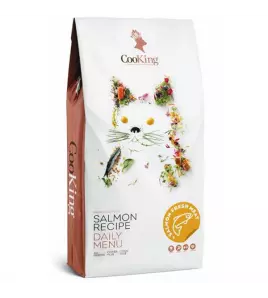 Сухий корм CooKing беззернова формула з свіжим м'ясом для дорослих котів. Повнораціонний збалансований беззерновий сухий корм Adult Salmon виготовляється сирої риби та свіжого курячого м’яса, що забезпечує високу засвоюваність. А унікальна технологія виготовлення дозволяє зберегти всю користь натуральних інгредієнтів. Склад: Свіжий лосось (мінімум 30%), картопля, свіже куряче м'ясо (мінімум 20%), бобові, жир домашньої, пивні дріжджі, гідролізат курячої печінки, олія лососева, овочі (цикорій, морква, зелена квасоля, кольрабі), мінеральні речовини, лігноцелюлоза, яблучна клітковина, хондропротекторний комплекс (глюкозамін гідрохлорид, хондроїтин сульфат, МСМ, екстракт зелених мідій (Perna canaliculus)), таурин, манно-олігосахариди, фрукто-олігосахариди, рослини (календула, шавлія, пажитник, кріп, чебрець, шипшина), екстракт Юкки Шидігера, пребіотики, екстракти (червоних плодів, цитрусових, насіння розторопші, насіння зеленого чаю, м'яти, розмарину), натуральні антиоксиданти, живі пробіотики (E. faecium). Аналітичний склад: Сирий білок: 36 % Сирий жир: 17 % Сира клітковина: 3 % Зола: 8 % Кальцій: 1,3 % Фосфор: 0,8 % Омега 3: 0,52 % Омега 6: 1,89 % Хондроїтин 665 мг/кг Глюкозамін: 1,055 мг/кг Амінокислоти: Таурин: 1200 мг/кг