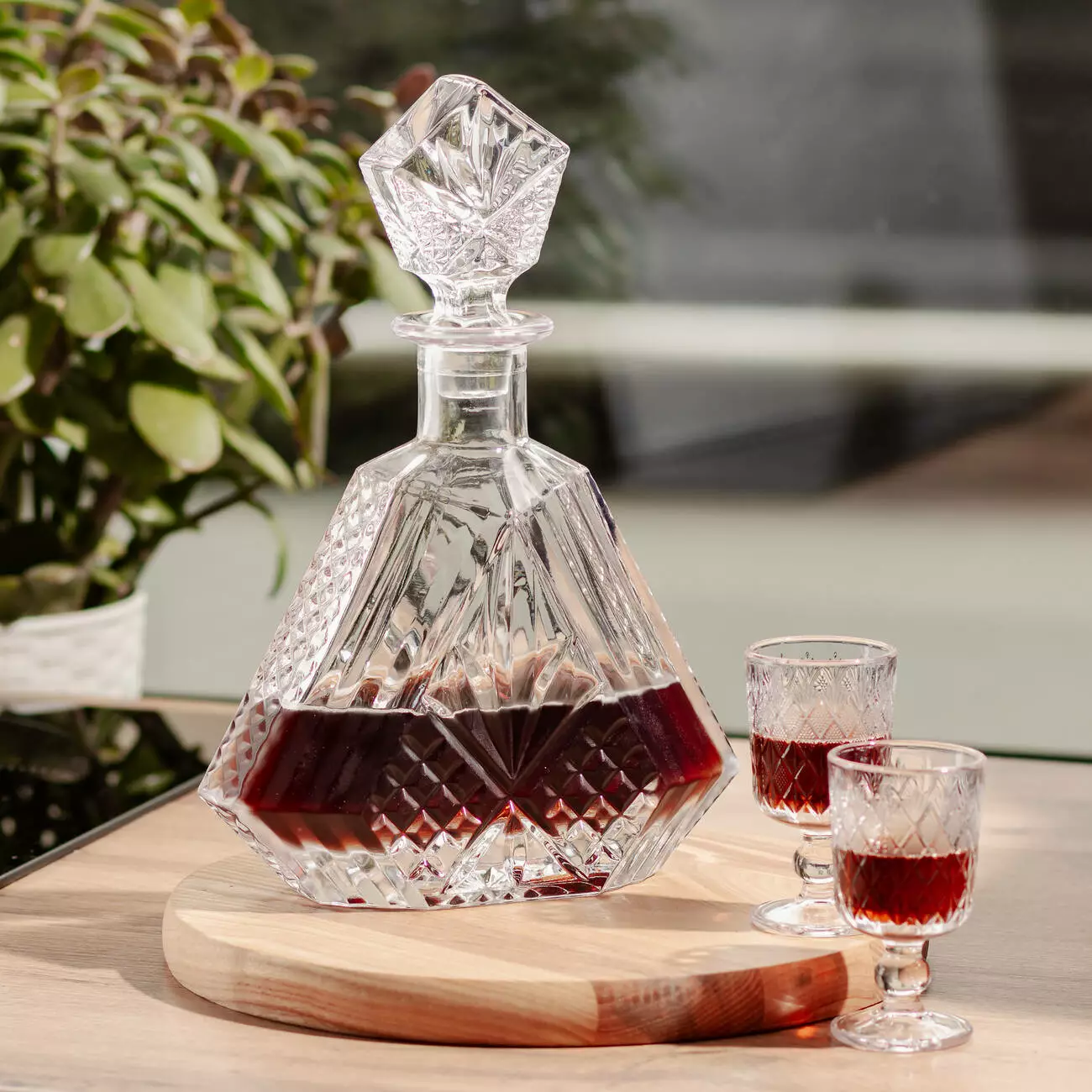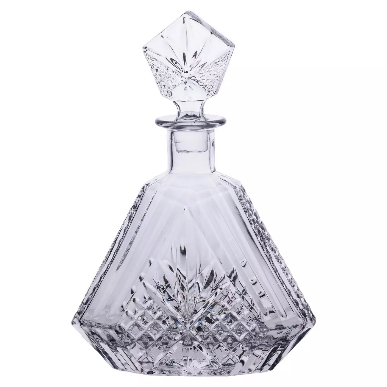 Модель має трикутну форму корпусу, що додає графіну геометричної виразності та забезпечує зручність тримання в руках. Щільна скляна кришка точно прилягає до шийки та захищає вміст від пилу й випаровування. Конструкція забезпечує герметичність, зберігаючи смакові характеристики напою незмінними.