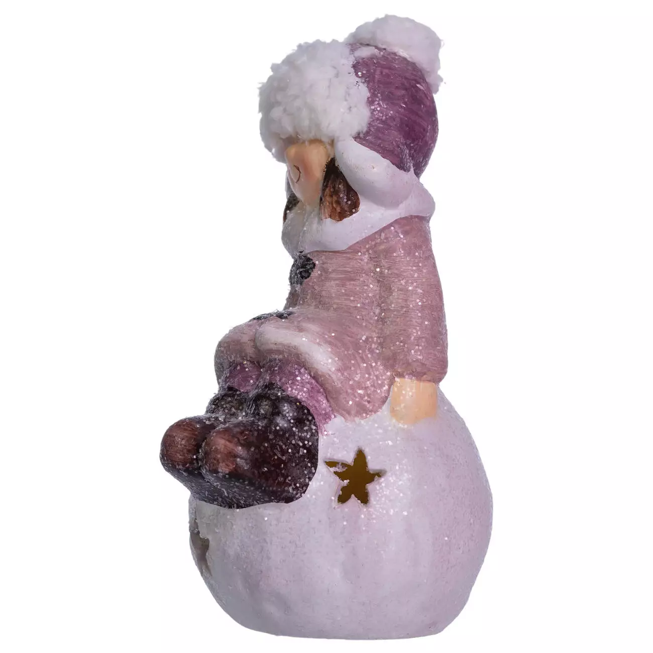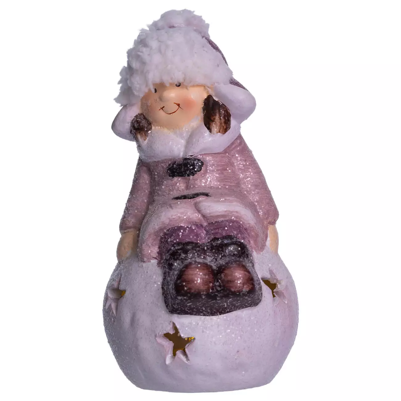 Ця порцелянова фігурка зображує дівчинку, що сидить на сніжній кулі, створюючи затишну зимову сцену. Вона одягнена в рожеве пальто з білим хутром, темні чобітки та пухнасту шапку. Її обличчя усміхнене, очі заплющені, а щоки — рум’яні, що додає образу тепла й спокою.