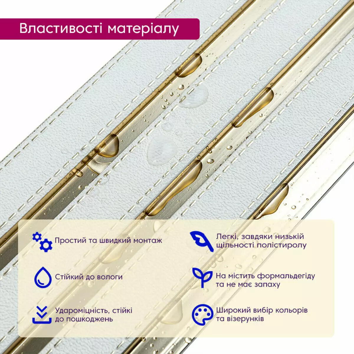 • Безпека: Матеріали не містять формальдегіду і не мають запаху.