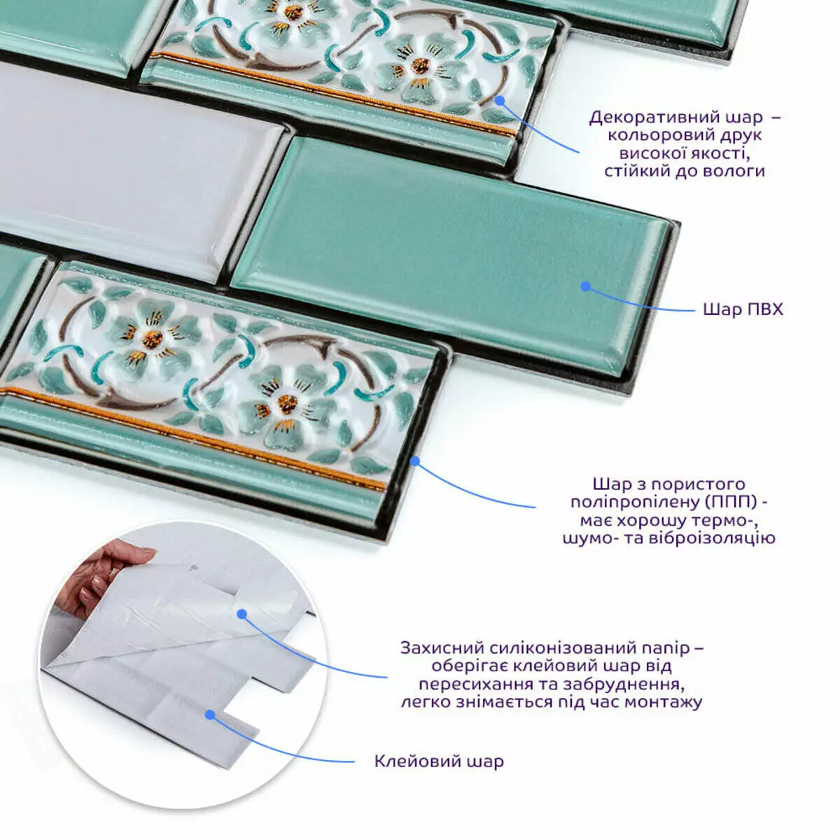 Декоративна ПВХ плитка на самоклейці м'ятна