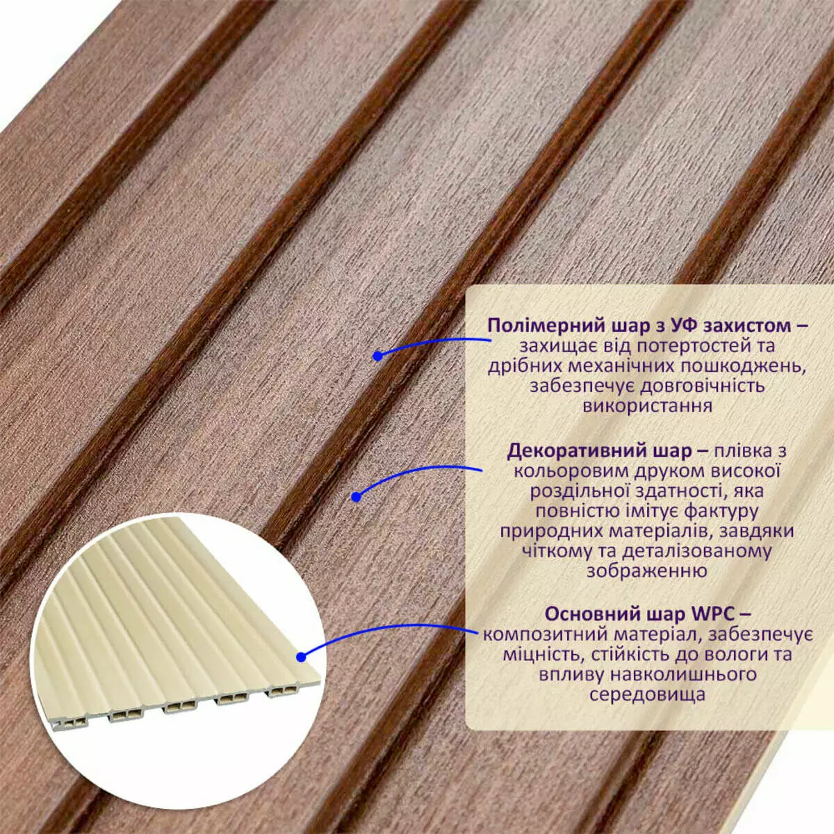 • Основний шар WPC: є композитним матеріалом, який поєднує в собі деревні волокна (або стружку) з полімерними матеріалами, що забезпечує матеріалу міцність, стійкість до вологи і стійкість до впливу зовнішнього середовища.