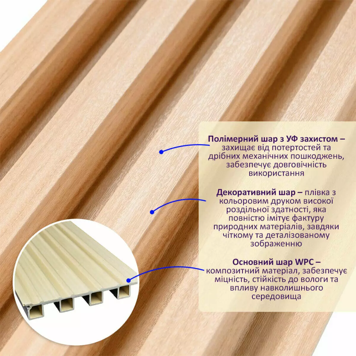• Основний шар WPC: є композитним матеріалом, який поєднує в собі деревні волокна (або стружку) з полімерними матеріалами, що забезпечує матеріалу міцність, стійкість до вологи і стійкість до впливу зовнішнього середовища.