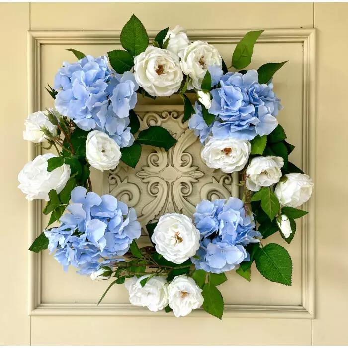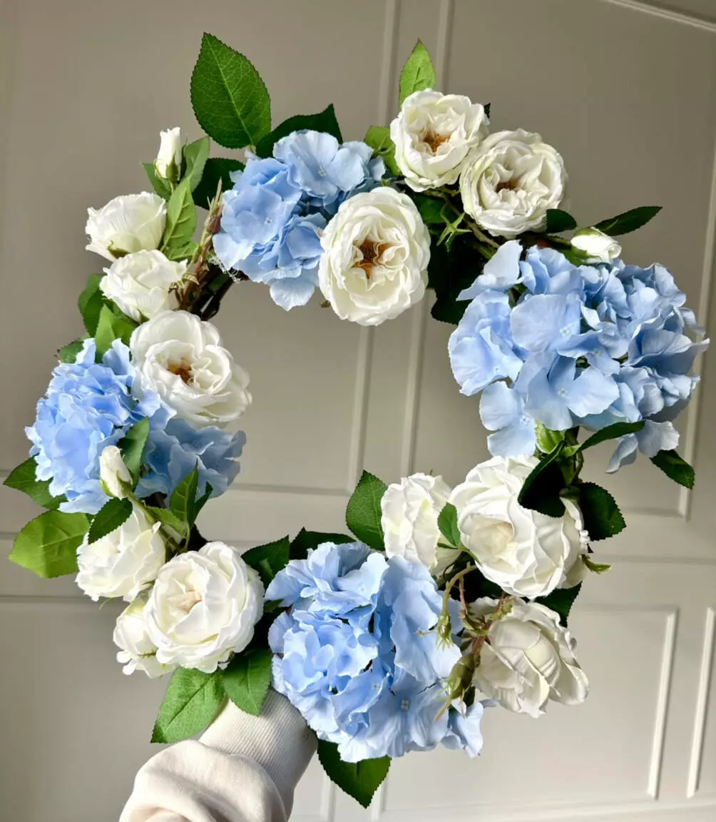 Декоративный венок из искусственных цветов Английский сад — это утончённый акцент для вашего интерьера, воплощающий эстетику аристократического сада. Гармоничное сочетание голубой гортензии и белых английских роз создаёт нежную и одновременно элегантную атмосферу. Натуральная основа из ветвей глицинии придаёт венку природную текстуру и изысканный шарм.