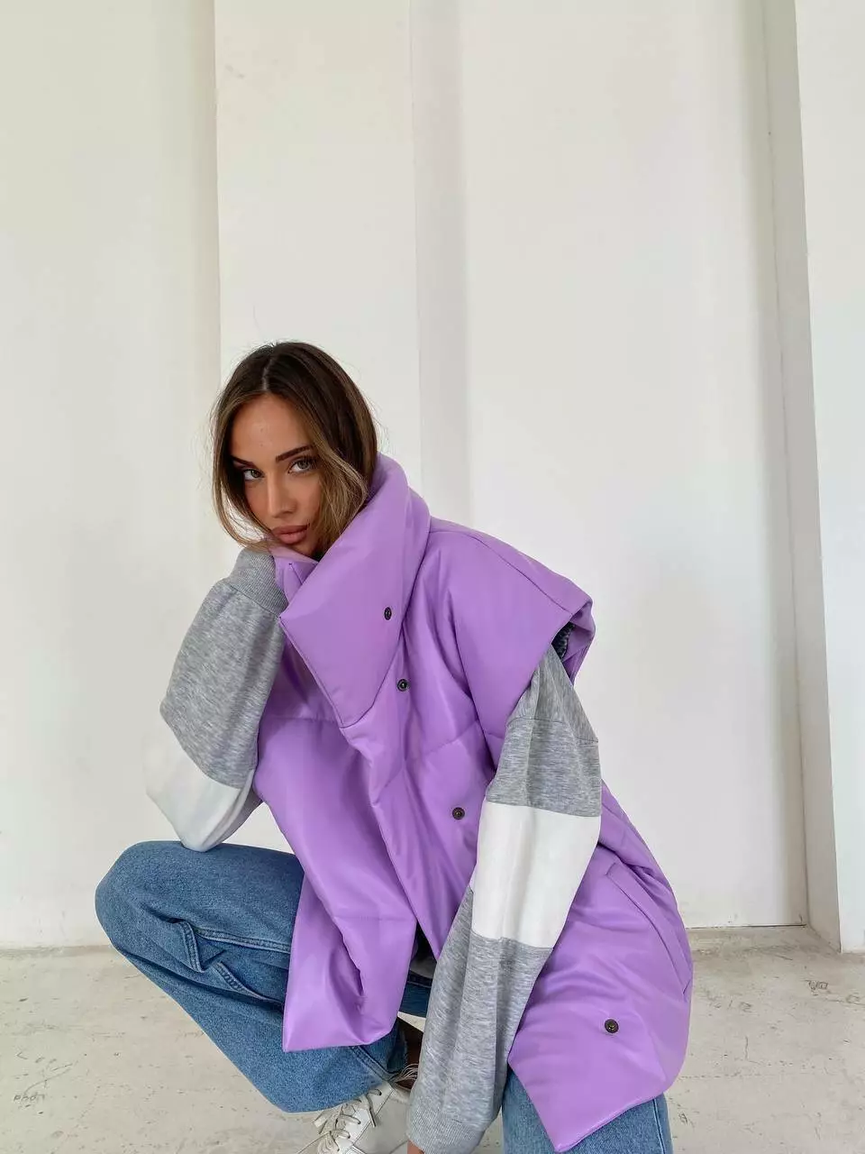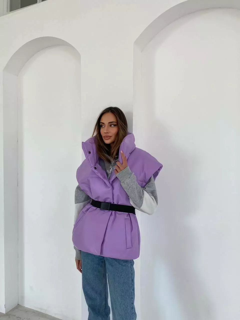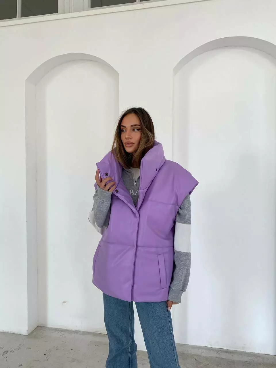 Демісезонний трендовий жилет Desing з екошкіри утеплювач силікон 200 лавандового кольору