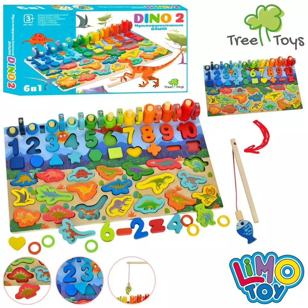 Дерев'яна іграшка Багатофункціональна дощечка MD 1947 (20шт) рамка-вклад (діно/цифри), кільця, кор,40,5-23-5см