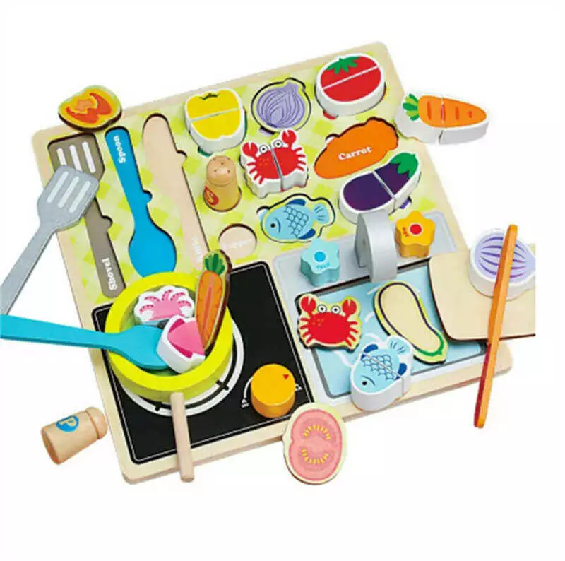 Вкладиші С 65804 (24) “Кухня”, дерев’яні, 22 елементи, набір продуктів, елементи на липучках, безпечний ніж, дошка для нарізання, в коробці