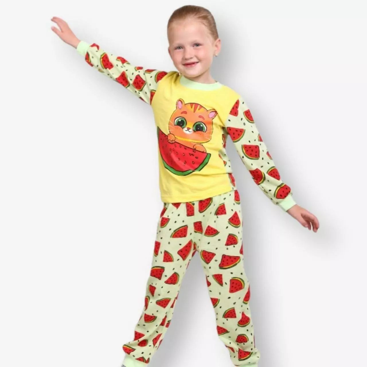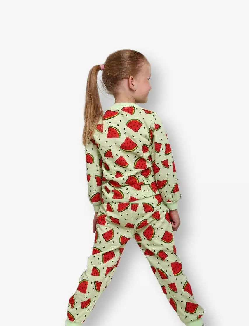 Модная и удобная детская пижама для девочки. Комплектация: кофта с длинным рукавом+штаны. Материал: кулир. Мягкая и приятная к телу. Свободный и удобный крой. Штанишки на мягкой резинке. На штанинах и на рукавах манжеты.
