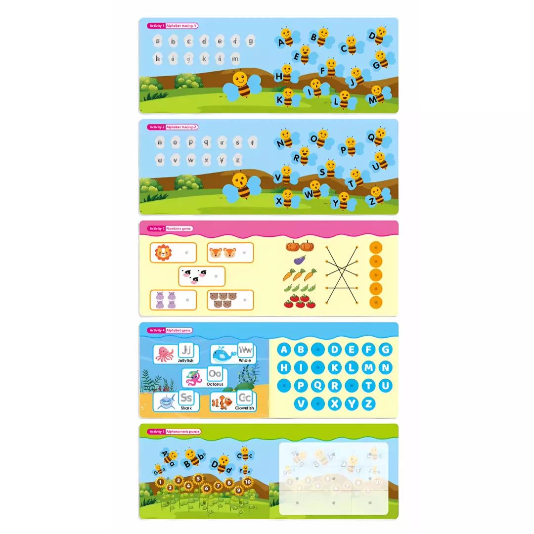 Книга Монтессори содержит 5 красочных страниц с заданиями, среди