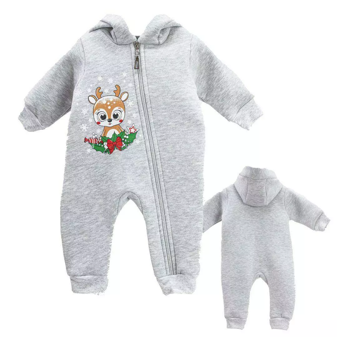 Ромпер застегивается на молнию и имеет капюшон, на рукавах и внизу на ножках - трикотажный манжет. Украшен новогодним принтом.