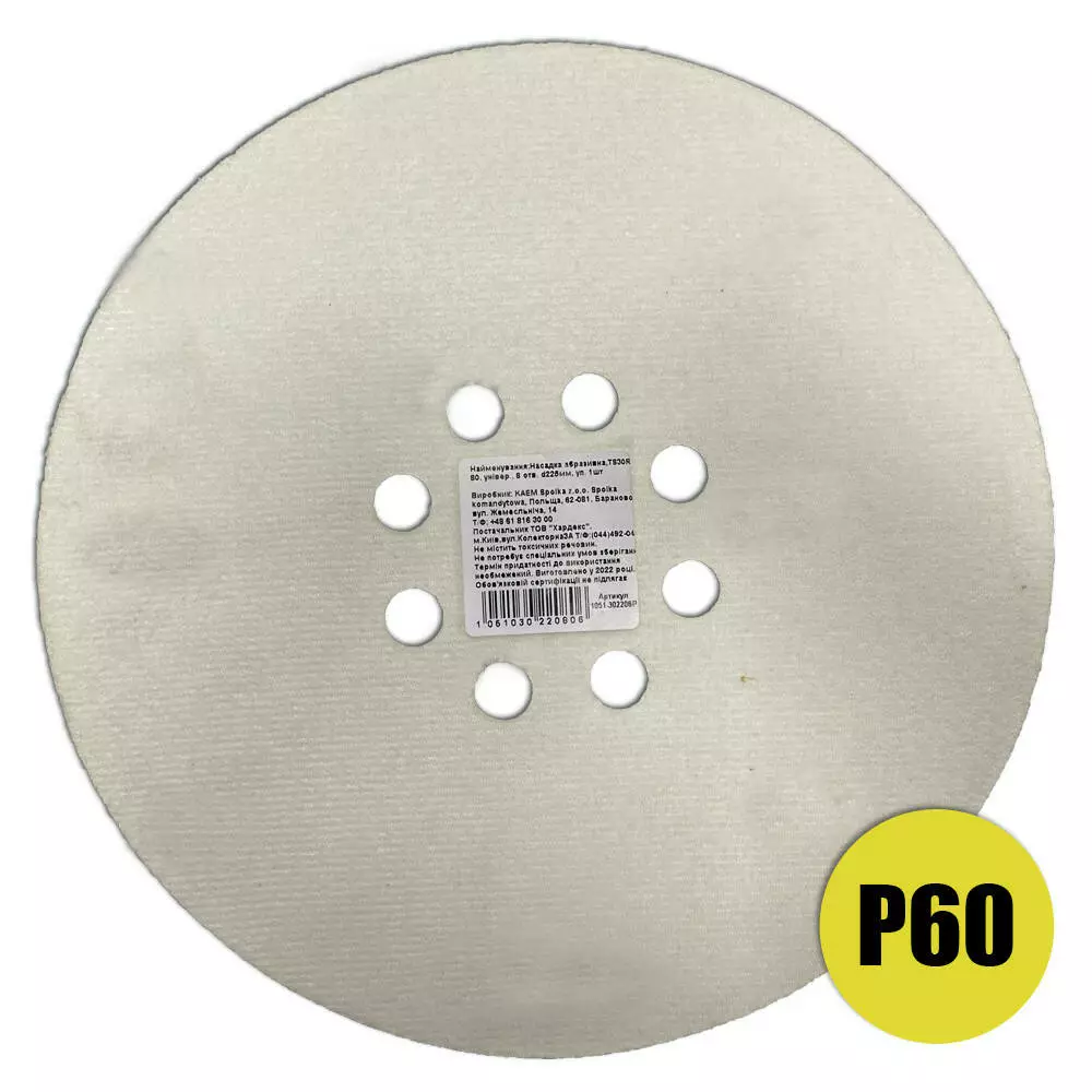Диск абразивный шлифовальный круг самозацепной на липучке с отверстиями Grone TS30R, зерно P60, диаметр 225 мм
