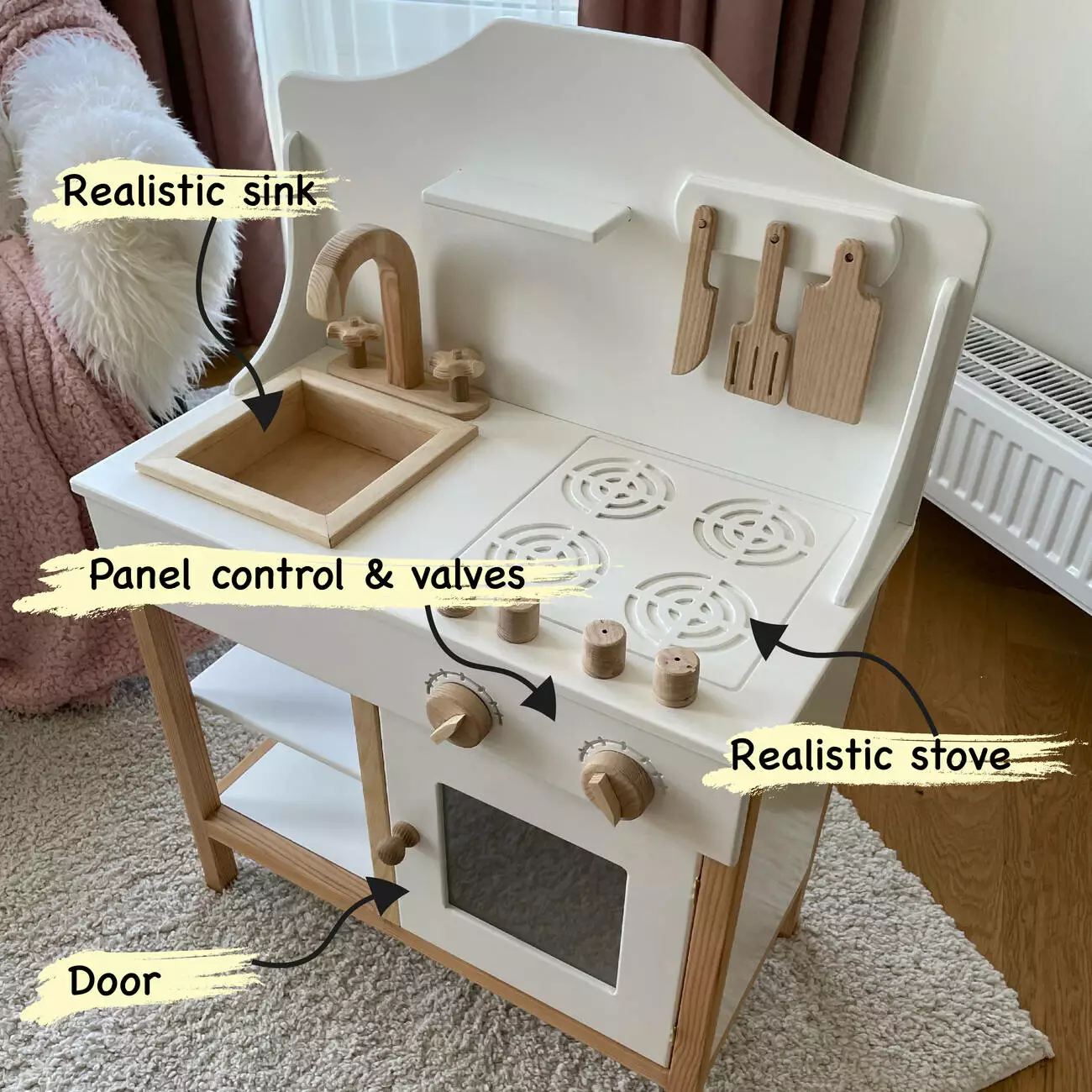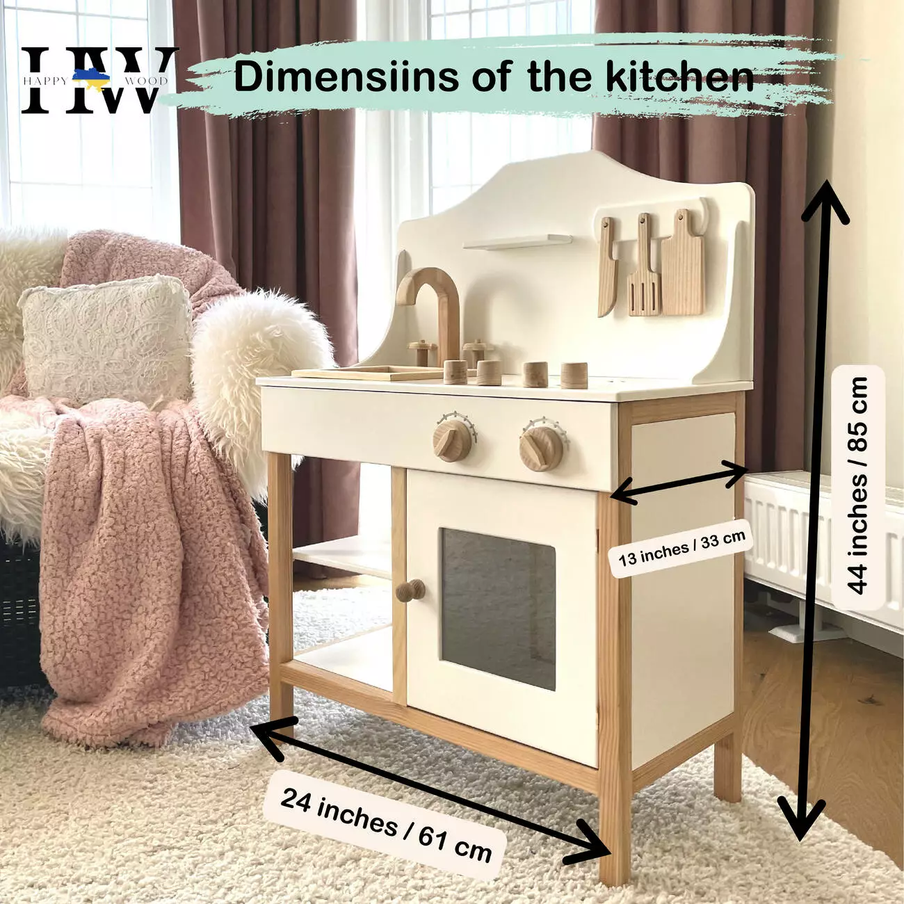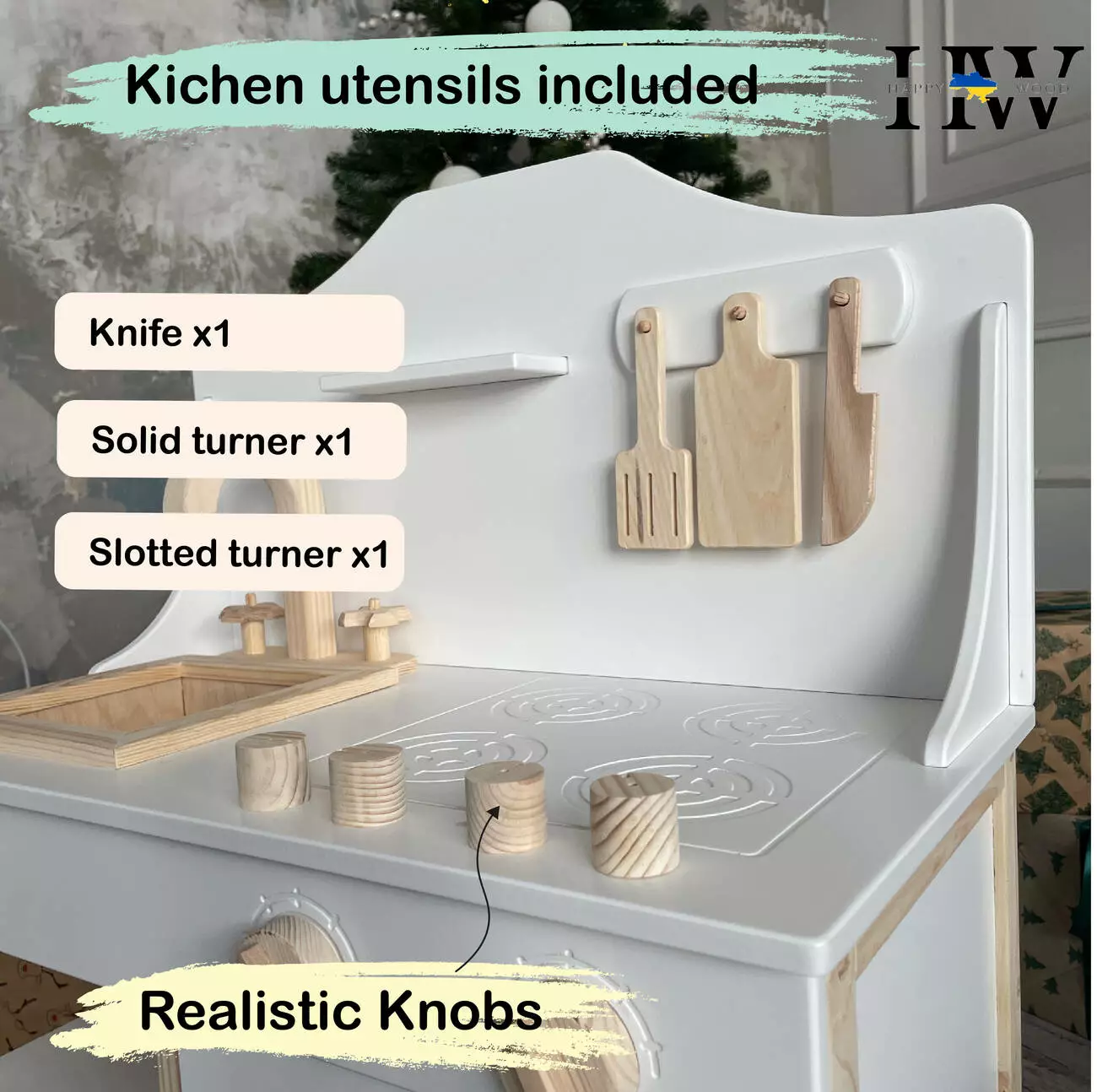 Подаруйте своїй маленькій господині справжню радість з дитячою дерев'яною кухнею Happy wood! Ця чарівна біла кухня - ідеальний подарунок для дівчаток, які мріють стати шеф-кухарями.