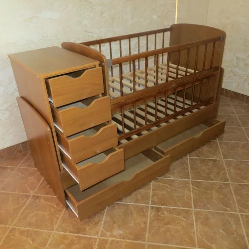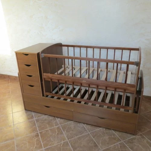 Дана модель дитячого ліжечка дозволить Вам комфортно використовувати її в перебігу багатьох років: передня стінка люльки відкидна, механізм для заколисування малюка, під рукою комод з 4 відділеннями, а також 2 містких ящика для дитячих іграшок і речей, 2 рівня днища, трансформується в ліжко для підлітка на букових ламелях.