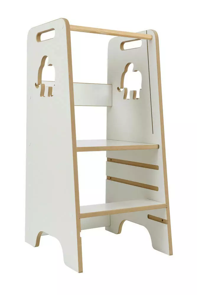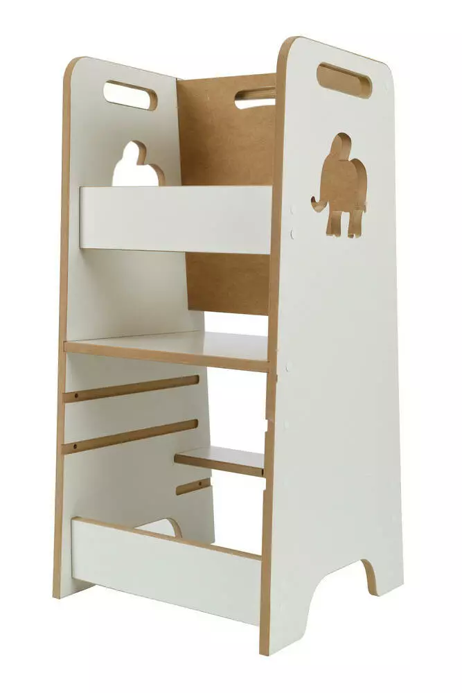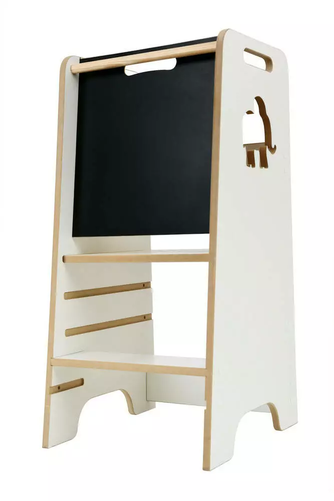 Ця модель кухонного помічника розроблена та виготовлена в Польщі з увагою до кожної деталі. Дошка для малювання та декоративний мотив слона роблять його не лише практичним, а й стильним елементом дитячого інтер’єру.