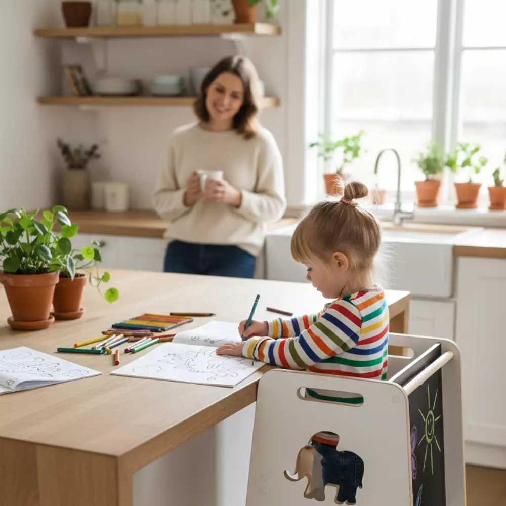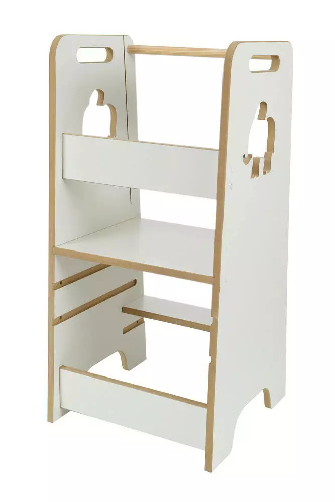 Кухонний помічник має стабільну конструкцію та захисні бортики, які запобігають падінню дитини. Міцна конструкція забезпечує довготривале використання, а регульовані сходинки дозволяють легко підлаштувати висоту під зріст дитини. Це чудовий вибір для батьків, які хочуть безпечно залучати дитину до домашніх справ.