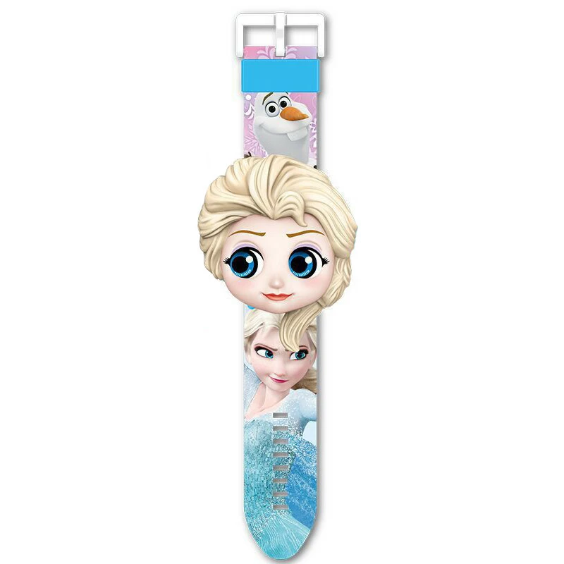 Дитячий електронний годинник зі світлодіодним проектором на 24 зображень на ремінці з малюнком з мультфільму Холодне серце (Frozen). Зображення на годиннику перемикаються автоматично при натисканні на бічну кнопочку на годиннику проектуючи їх на поверхню.