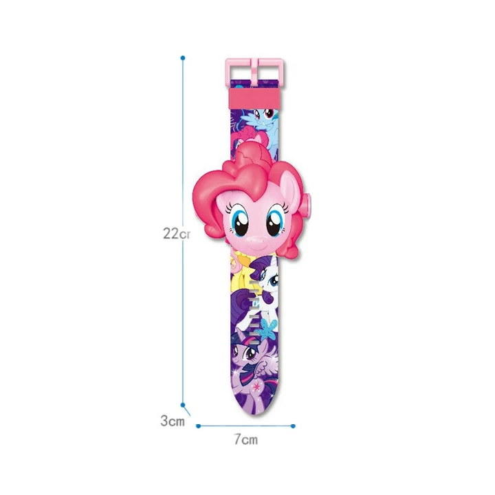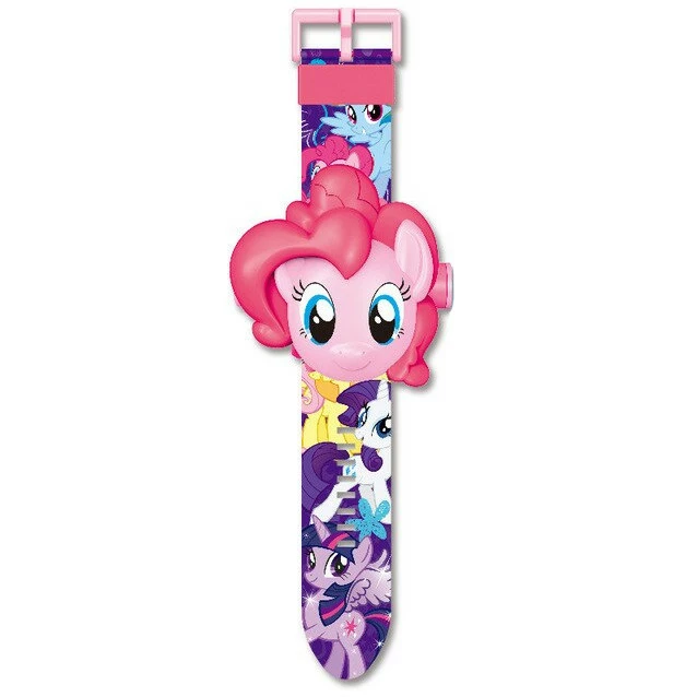 Дитячий електронний годинник зі світлодіодним проектором на 24 зображень на ремінці з малюнком з мультфільму Мій маленький Поні (My Little Pony). Зображення на годиннику перемикаються автоматично при натисканні на бічну кнопочку на годиннику проектуючи їх на поверхню.