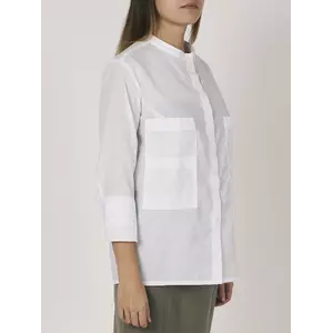 3. Дизайнерская белая рубашка свободного кроя с асимметричными декоративными швами. Спереди один карман со складкой. Сзади шлица. Длинный рукав.